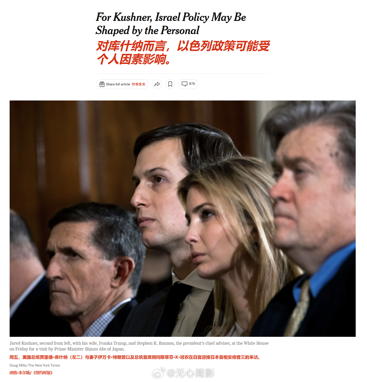 回顾《纽约时报》在2017年介绍特朗普女婿库什纳的文章,里面提到,以色列总理内塔