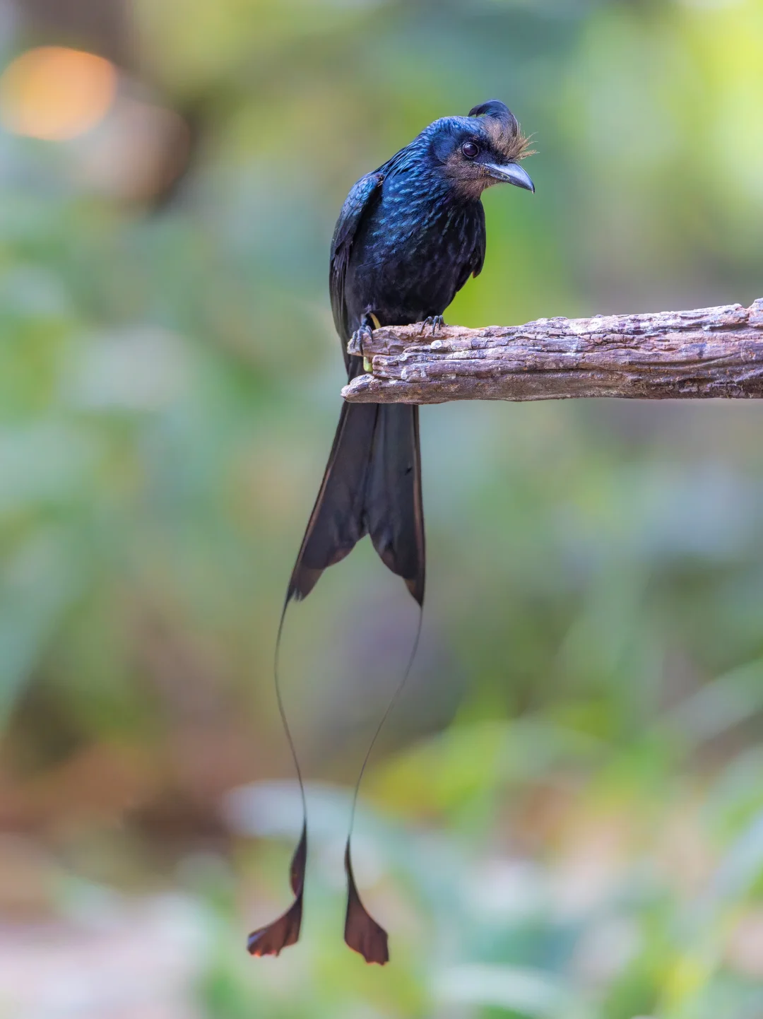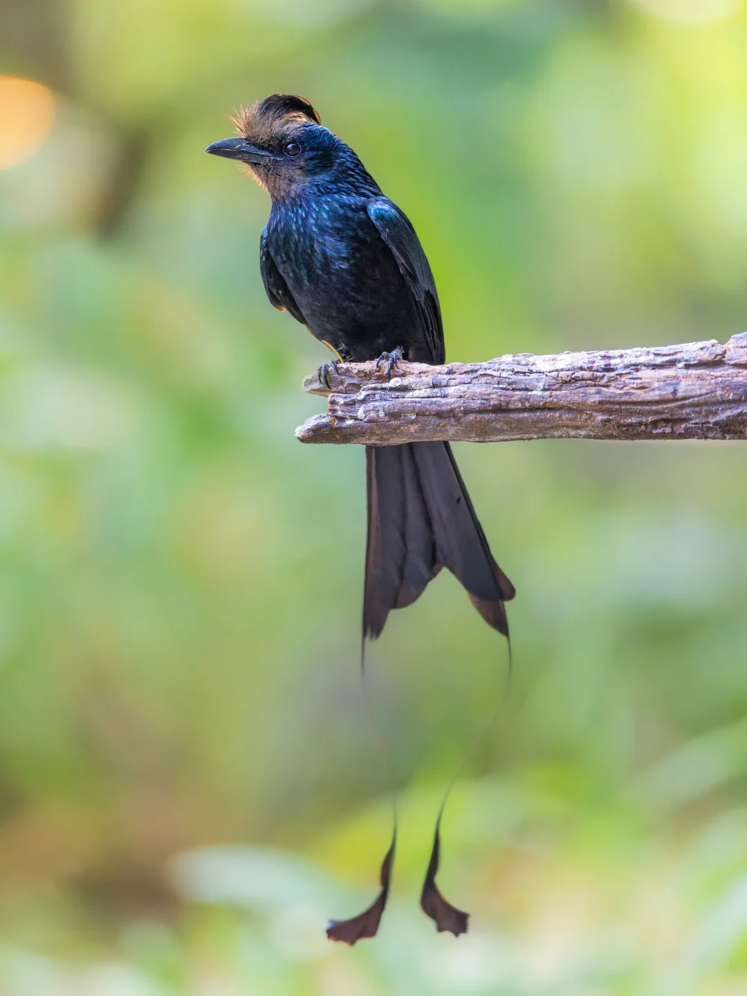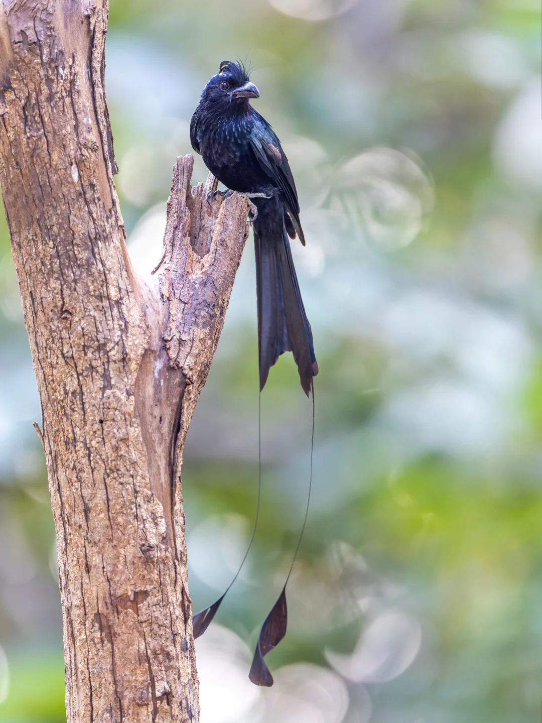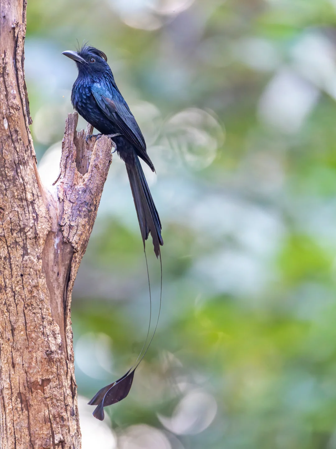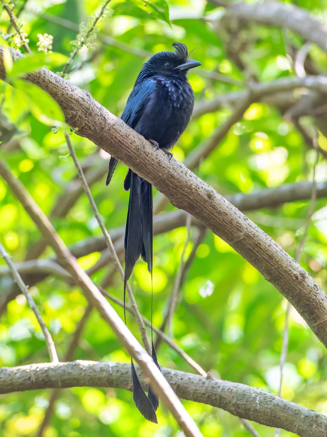 原创拍摄 大盘尾,Greater Racket-tailed Drongo,雀形目卷尾科卷尾属。延长的外侧尾羽,和终端的网球拍状羽片,是它们的特色。 这两年大盘尾在我的观鸟记录中出现次数也是多了起来,但是每次看到还是对这种优美的鸟由衷赞叹。 第一个就是大盘尾是真的挺“大”的,体长可以超过60厘米,外侧尾羽可以到40里面。在林中翻飞还是很显眼的 第二个就是低调的奢华,颜色暗黑低调(透着金属光泽),戴着冠羽,异常长的尾羽,末端还有个卷曲的球拍。