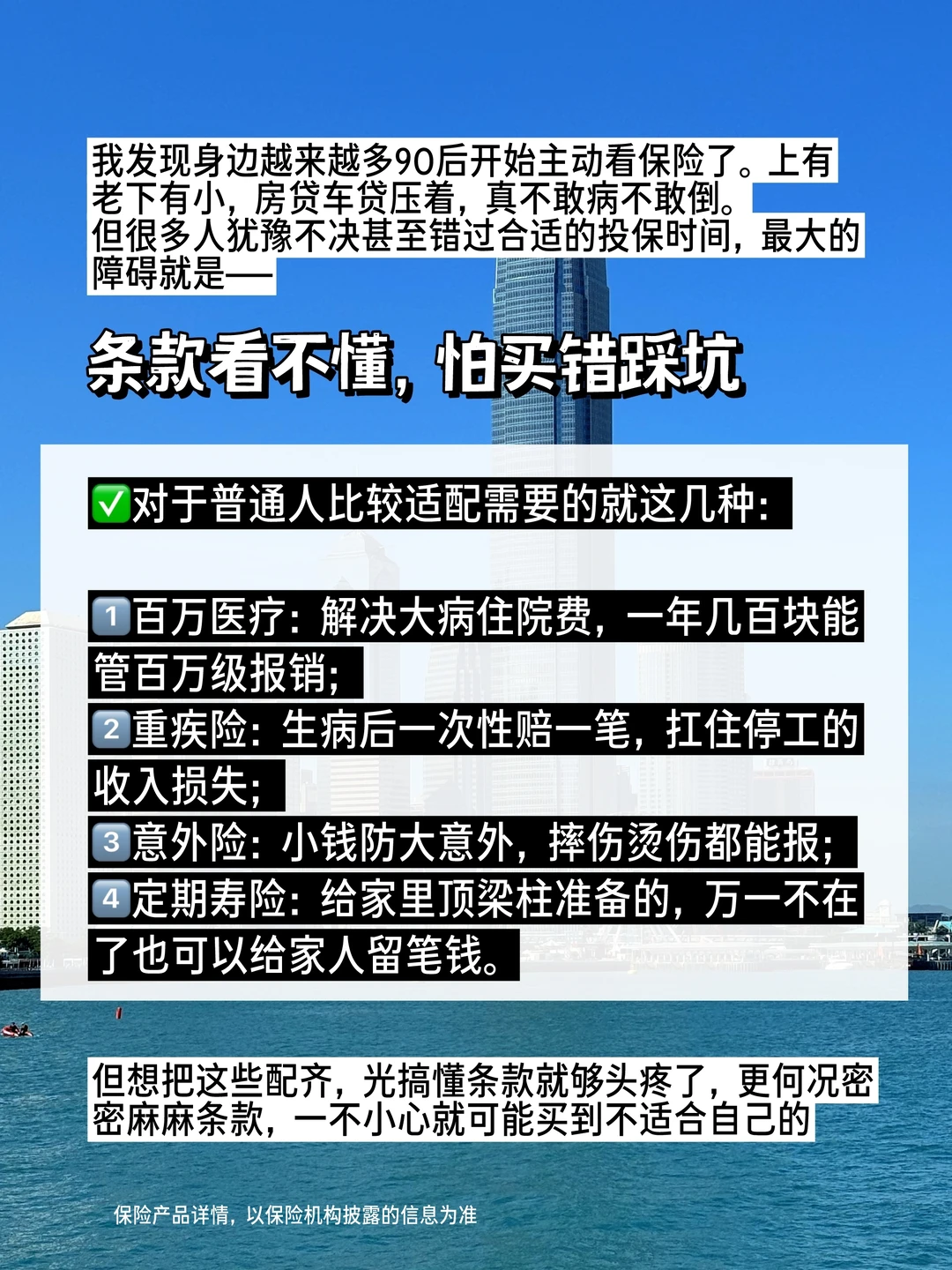 我发现身边越来越多90后开始主动看保险了。上有老下有小,房贷车贷压着,真不敢病不敢倒。但很多人犹豫不决,最大的障碍就是——条款看不懂,怕买错。