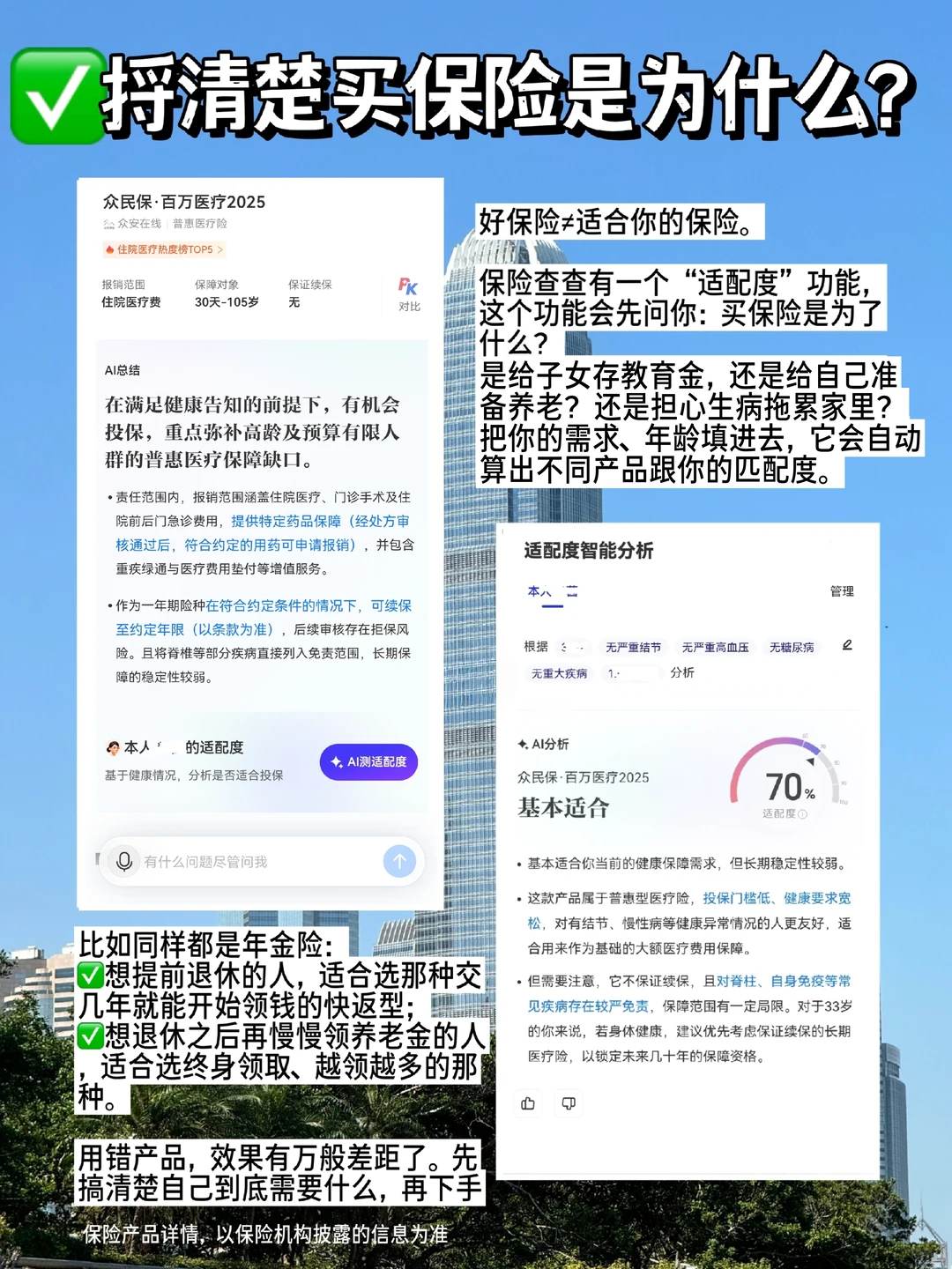 它的“适配度”功能,会先问你:买保险是为了什么?是给子女存教育金,还是给自己准备养老?还是担心生病拖累家里?把你的需求、年龄填进去,它会自动算出不同产品跟你的匹配度。
