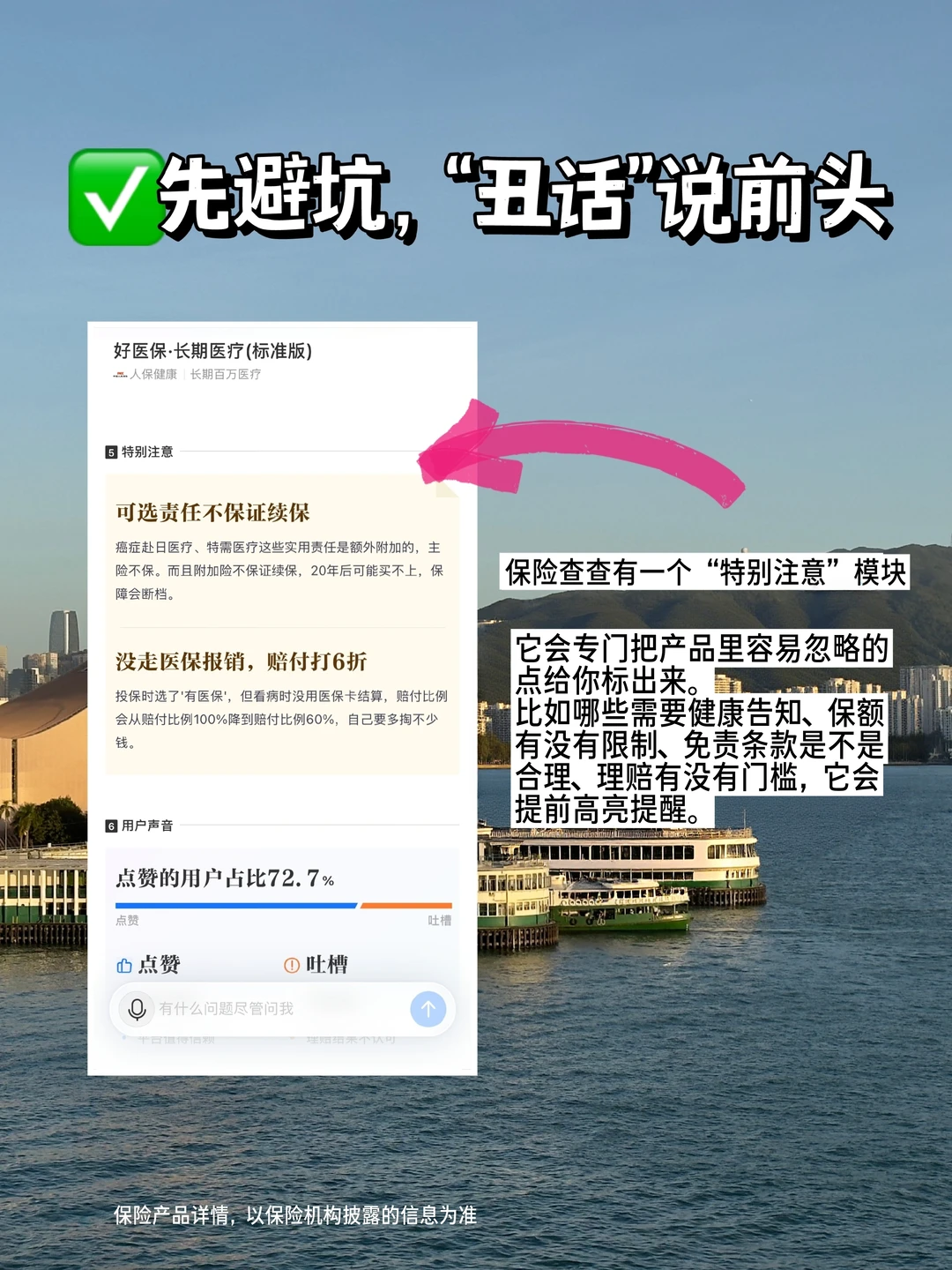 比如哪些需要健康告知、保额有没有限制、免责条款是不是合理、理赔有没有门槛,它会提前高亮提醒。