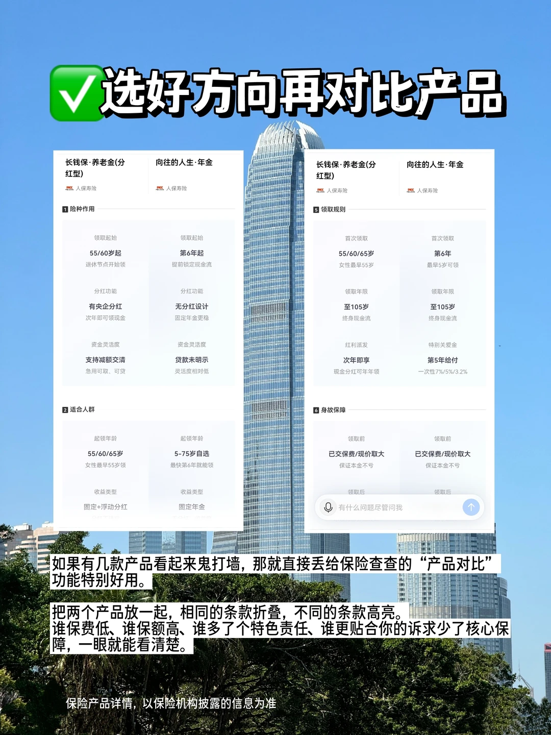 如果有几款产品看起来鬼打墙,那就直接丢给“产品对比”功能。把两个产品放一起,相同的条款折叠,不同的条款高亮。谁保费低、谁保额高、谁多了个特色责任、谁更贴合你的诉求,一眼就能看清楚。