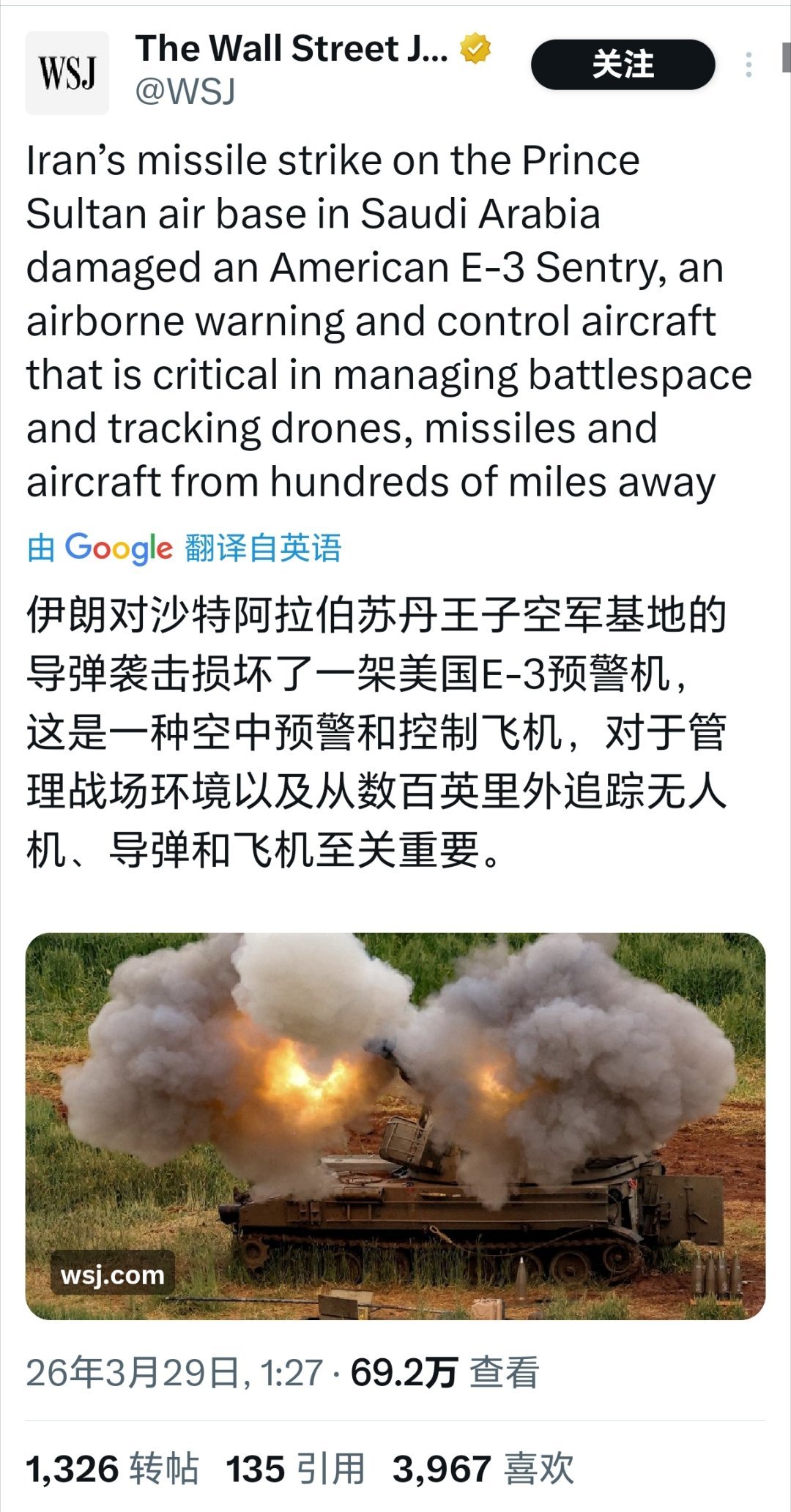 美国预警机遭伊朗袭击被毁伊朗议长卡利巴夫转发《华尔街日报》报道,引用特朗普语气评论:仅受轻微损伤 🤏🤏🤏
