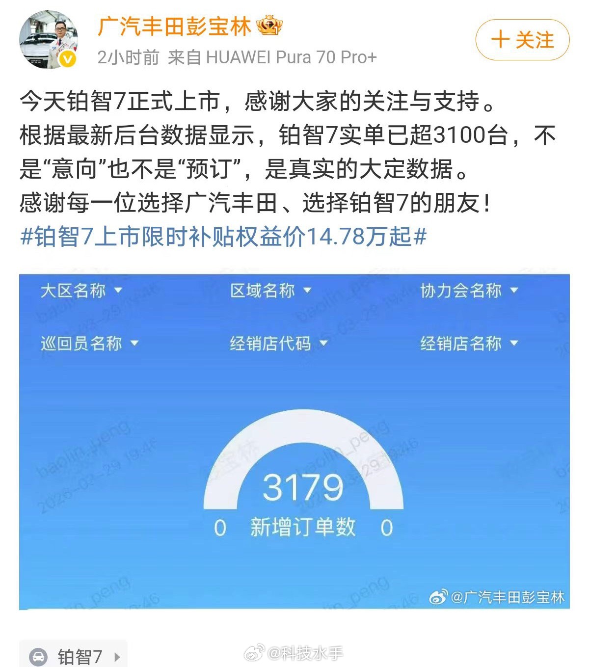 铂智7上市锁单超3100台现在公布销量数据确实越来越卷透明度了。广汽丰田高管最近在社交平台分享了铂智7在3月29日上市当天的后台截图,数据显示锁单量突破了3100台。