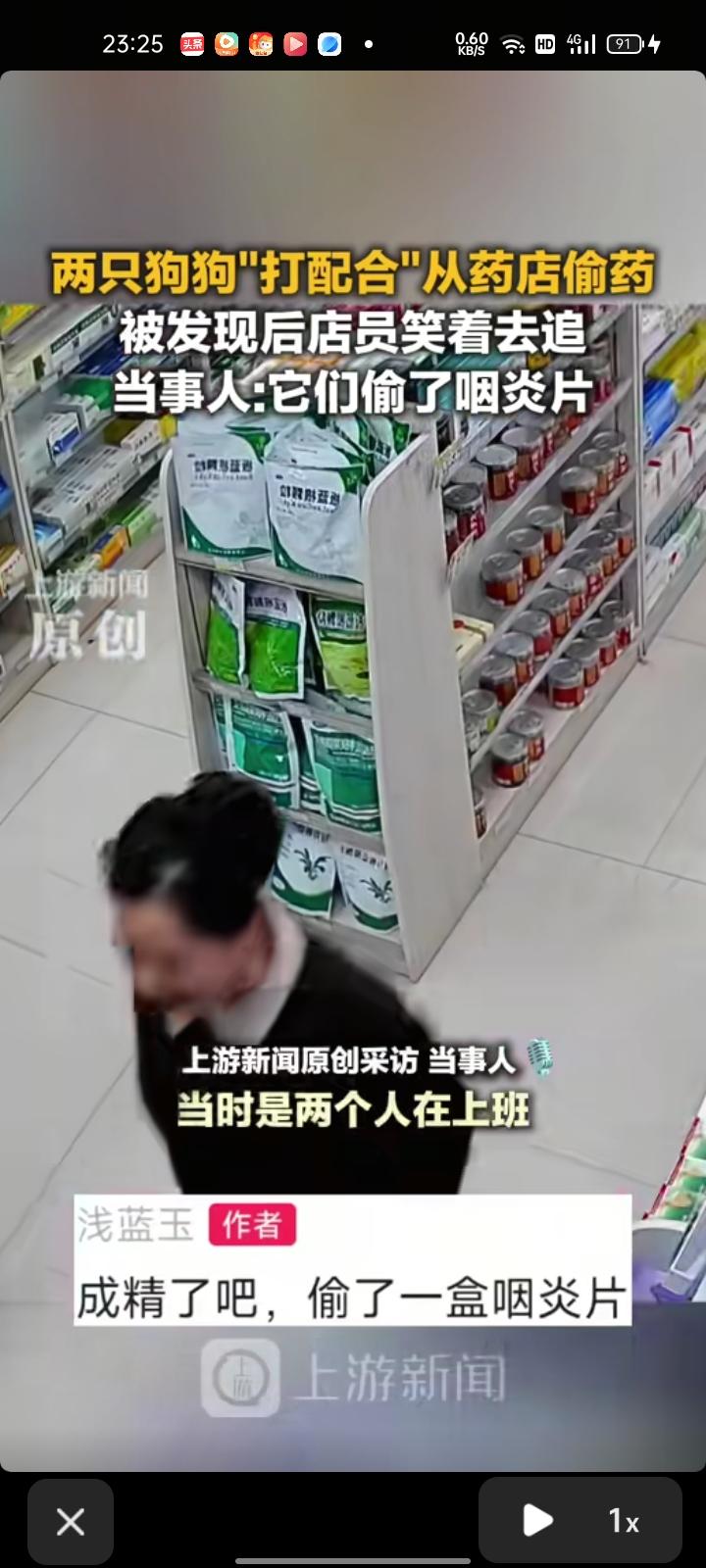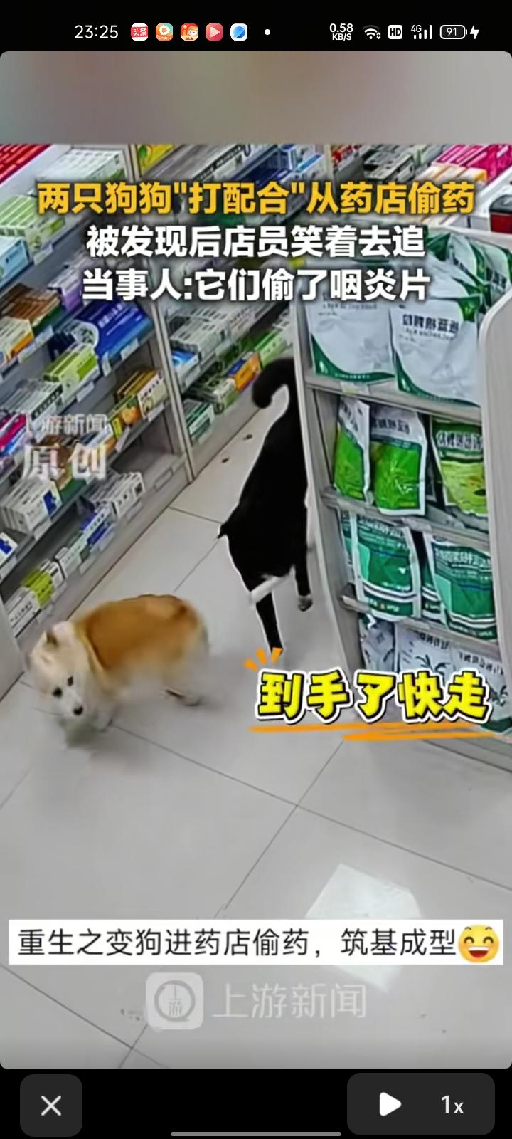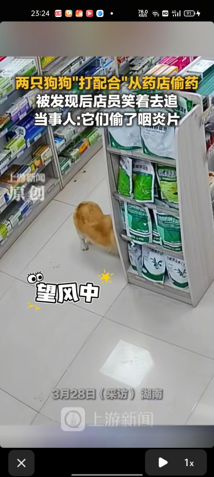 3月27日,湖南长沙。两只狗狗默契配合在药店偷药,直接叼着药跑了,两个女店员边笑边追,追到了隔壁超市。店员称,狗狗偷的是咽炎片,已经追回来了。见过人偷药,第一次见到狗偷药的