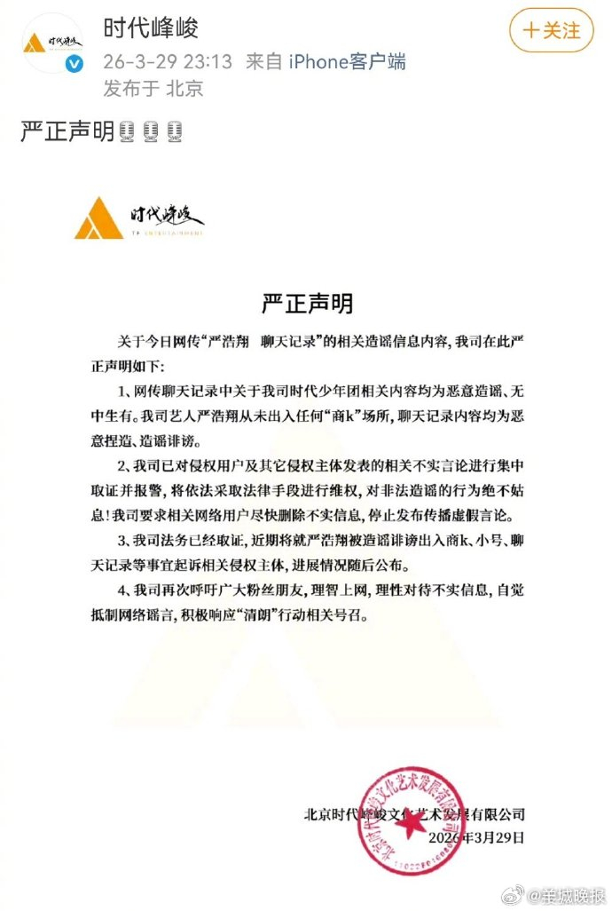 #时代峰峻否认网传聊天记录#3月29日,针对#严浩翔 聊天记录# 一事,时代峰峻