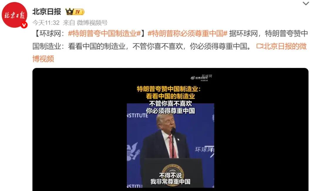 特朗普:我非常尊重中国,你看看他们做得有多好 当地时间3月27日,美国总统特朗普在佛罗里达州迈阿密举行的未来投资倡议峰会上发表演讲,他在会上夸赞中国制造业。 但看看中国,他们做得多么出色,产量多么惊人。我的意思是,他们生产的汽车如此之多,以至于他们之间甚至会比赛看谁能生产出最少的汽车,因为他们的汽车实在太多了。” “你看看中国,他们做得多么出色,制造业多么强大,”特朗普说,“你必须充分尊重中国的成就,不管你喜不喜欢,你都必须尊重中国。” 特朗普在说完“美国无疑是全球范围内最炙手可热的国家”后说道,“我不得不说,我非常尊重中国,你看看中国他们做得有多好,制造业多么发达。他们生产的汽车太多了,以至于举行了一场比赛看哪家造的车最少,因为他们的车实在太多了。你必须尊重中国的成就,不管你喜不喜欢,你都必须尊重中国。” 其实特朗普能说出这番话,一点都不奇怪,他这辈子做生意,最看重的就是实际结果,从来不是书本里的那些空话套话。 特朗普先吹嘘美国是“世界上最火热的国家”。随后话锋一转提到中国,称中国值得尊重。“不得不说,我非常尊重中国,看看中国他们做得多好,制造业多么发达,你必须尊重中国的成就,不管你喜不喜欢中国,但你必须尊重中国。” 特朗普这次当着全世界的面说出这番话,其实就是把所有人都看在眼里的事实,亲口说了出来。 不管是什么理论,什么体系,最终能让国家的产业发展起来,能拿出实实在在的成绩,能让老百姓的日子越过越好,就是有效的,就是值得被尊重的。 而咱们中国这些年的发展,早就用实打实的结果,证明了这一点,这一点,就算是向来心高气傲的特朗普,也没法不承认。
