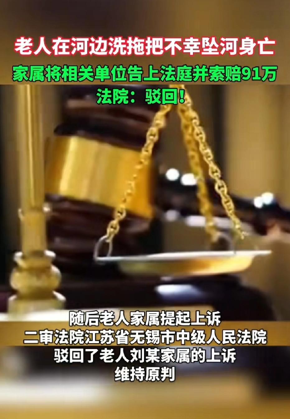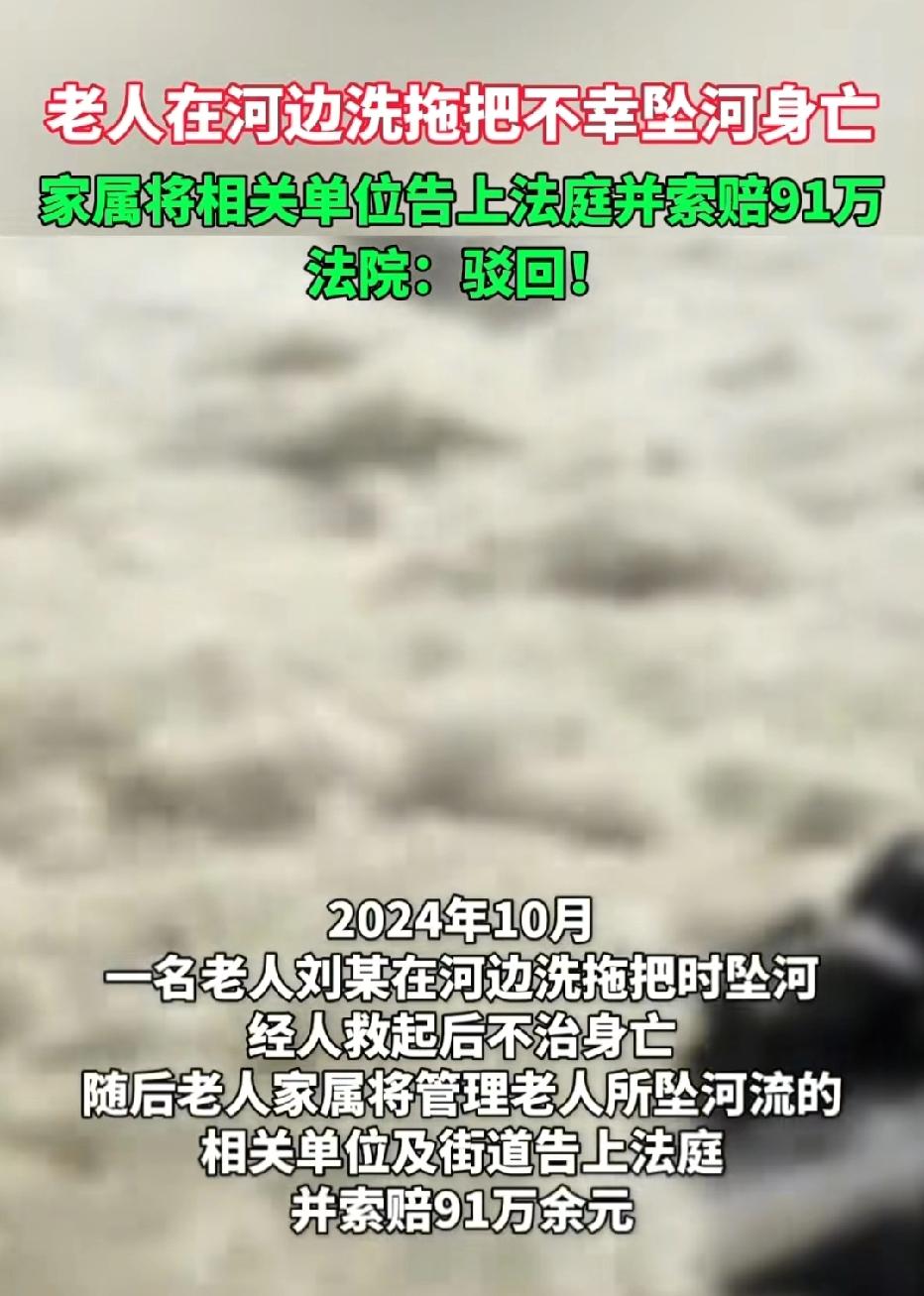 江苏,66岁老人在河边洗拖把,不小心掉进河里不幸溺亡。家属认为,河边没有警示牌,又离居民区和道路太近,管理部门没尽到安全责任,将河道管理单位和街道告上法院,索赔91万余元。案子经过一审、二审,法院这样判! 2024年10月26日,突降小雨,路面湿滑。66岁的刘某不顾天气恶劣,像往常一样扛着拖把走向家附近的河道台阶,准备清洗拖把。 谁也没想到,这一去竟成永别。 几分钟后,岸边传来呼救声,刘某不慎失足坠入河中,虽被路人及时救起送医,但最终因抢救无效不幸溺亡。 一场意外,让家属悲痛万分。 事发河道紧邻居民区,是当地居民日常取水、清洗的常用区域,岸边设有自然形成的亲水台阶,是常见的便民设施。 刘某溺亡后,其家属认为,河道管理单位和街道办事处未尽到安全管理责任,是导致悲剧发生的重要原因。 家属提出,事发河段未设置明显的安全警示牌,也未安装护栏等防护设施,且河流与居民区、道路距离过近,存在极大安全隐患,管理部门理应承担赔偿责任。 为此,家属将河道管理相关单位及街道办事处一并诉至法院,要求赔偿丧葬费、死亡赔偿金、精神损害抚慰金等共计91万余元。 案件审理过程中,双方围绕管理部门是否尽到安全保障义务展开激烈争论。 家属坚持认为,河道作为公共区域,管理部门有义务消除安全隐患,设置警示标识、安装防护设施是基本职责,正是因为管理缺失,才导致刘某失足落水身亡。 而被告方则辩称,事发河道为开放性自然河道,并非经营性公共场所,其主要职责是保障河道行洪安全、维护河堤稳固,而非对居民自发的亲水行为进行全方位防护。 同时,该河道周边已按规定进行基础维护,且沿河台阶是当地居民长期使用的便民设施,强制安装护栏既不符合农村生活习惯,也超出了管理部门的合理职责范围。 《民法典》第1165条规定:行为人因过错侵害他人民事权益造成损害的,应当承担侵权责任。 一审法院审理后认为,刘某作为具有完全民事行为能力的成年人,应当知晓雨天河道台阶湿滑、靠近水边存在危险,其在不利天气条件下自行前往河边洗拖把,自身未尽到审慎的安全注意义务,是导致溺亡的直接原因。 而河道管理单位及街道办事处已履行了河道维护、环境管理等基本职责,不存在管理失职行为,其管理行为与刘某的死亡结果之间无法律上的因果关系。 据此,一审法院驳回了家属的全部诉讼请求。 家属对一审判决不服,又提起上诉。 二审中,家属补充提交了相关证据,强调河道紧邻生活区,管理部门的警示义务和安全保障责任不应被免除。 《民法典》第1198条规定:宾馆、商场、银行、车站、机场、体育场馆、娱乐场所等经营场所、公共场所的经营者、管理者或者群众性活动的组织者,未尽到安全保障义务,造成他人损害的,应当承担侵权责任 。 二审法院经审理查明,事发河段的亲水台阶为自然形成,并非景区或经营性场所的专用设施,管理部门无需对其进行特殊改造。 同时,现有证据无法证明管理部门存在未履行法定管理职责的情形,开放性河道的风险具有普遍性,成年人应对自身行为负责。 最终,二审法院认定一审判决认定事实清楚、适用法律正确,驳回上诉,维持原判,明确河道管理单位及街道无需承担任何侵权赔偿责任。 刘某的悲剧令人痛心,但责任不能随意转嫁。 自然河道的风险客观存在,管理部门无法做到绝对无风险,而成年人的自我保护意识才是最关键的防线。 希望每一个人都能敬畏生命、远离危险,也愿公共管理更加人性化。 对此,你怎么看?