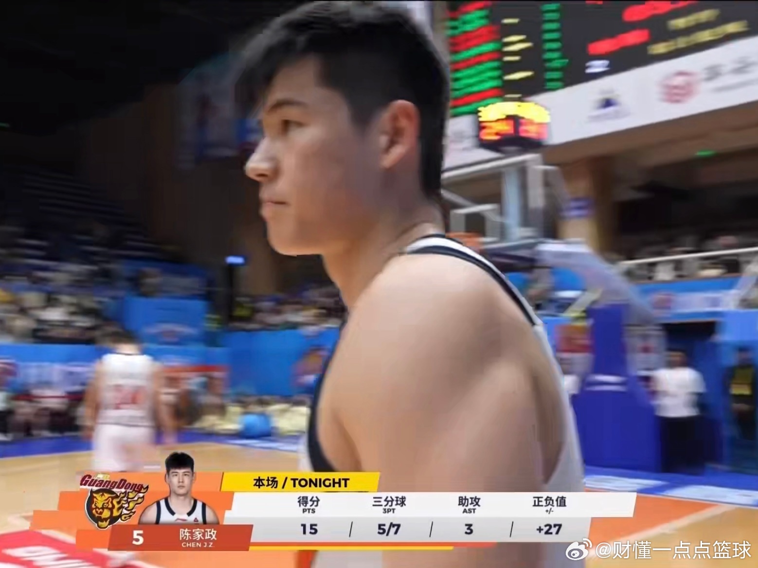 广东宏远102-54狂胜四川,小将陈家政迎来生涯之夜!首发出场打了26分钟,命中5记三分球,高效砍下15分4篮板4助攻,5记三分的表现刷新个人职业生涯三分命中数新高。陈家政今晚抓住机会,用精准的外线投射证明了自己的潜力。这场大胜不仅是球队的胜利,更是陈家政的成长里程碑。这位年轻射手的稳定输出,无疑为广东宏远的季后赛征程注入了新的活力。杜指导,陈家政值得更多的上场时间!陈家政广东男篮四川男篮vs广东男篮