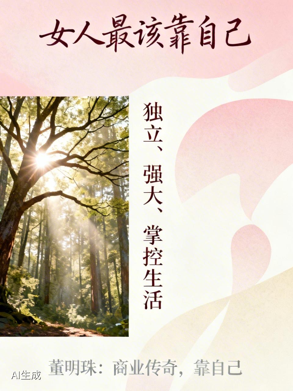 女人这辈子能靠谁呢?靠父母,父母终会老去,无法陪伴一生。我有个朋友,从小被父母捧在手心里,可父母年迈后,她也得独自面对生活的风风雨雨。靠男人?也不一定靠谱。有些女人把全部希望寄托在丈夫身上,可一旦婚姻出现问题,就会陷入困境。 其实,女人最该靠的是自己。有独立的经济,能自己做决定,遇到困难也有应对的能力。就像董明珠,凭借自己的努力成为商业传奇。女人只有自己强大,才能掌控生活,无论何时都有底气。