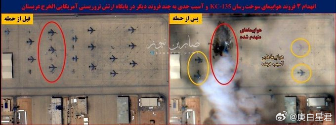 根据Landsat 8/9卫星拍摄的这张卫星图像显示,一架美国空军的KC-135R空中加油机被完全摧毁,多架受伤,以及一架或者两架E-3G“哨兵”预警机被波及受伤或摧毁!事实上,伊朗伊斯兰革命卫队空天军的主要目标似乎是停放在那里的美国空军E-3G预警机,而不是KC-135R。