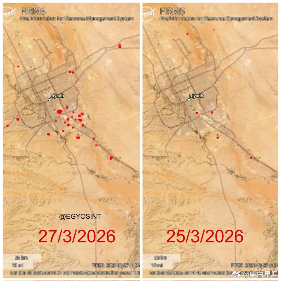 据报道,伊朗于周五向沙特阿拉伯苏丹王子空军基地发射了6枚弹道导弹和29架无人机。而且,这些导弹几乎全部命中目标,造成重大破坏,以及人员伤亡!当地时间3月26~27日,美国宇航局的FIRMS地图显示,利雅得及其周边地区有多处活跃火点,很可能是由伊朗导弹或无人机的碎片造成的。