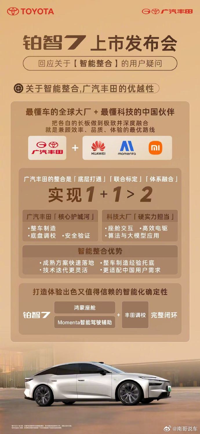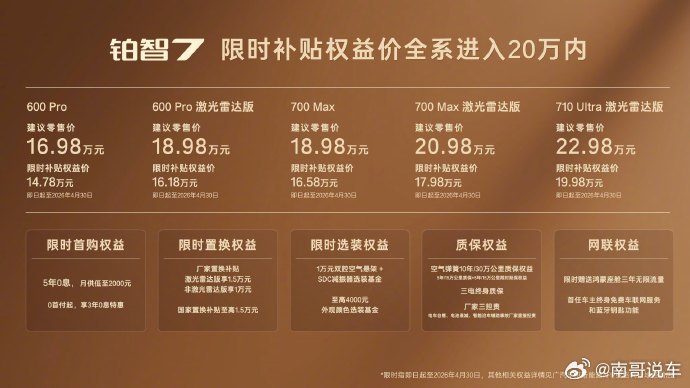 铂智7为啥稳了?首先看价格:600 Pro版14.78万起,700 Max激光雷达版17.98万,顶配710 Ultra激光雷达版19.98万。对比预售价最高降幅超3万。其次看级别:▶️ 车长5.13米、轴距3.02米,后排纯平地台+零重力座椅,空间对标行政级轿车、雷克萨斯/GR团队联合开发底盘。然后看配置:▶️ 鸿蒙座舱5.0、▶️华为电驱、▶️ Momenta R6智驾、▶️ 小米生态互联:车控家、家控车一体化,米家APP接入、▶️ 双腔空悬+预瞄系统:40mm高度调节,过坎不晃、过弯不偏。D级尺寸B级价格,丰田安全基底+华为/小米生态+终身进化智驾,真的没啥课挑剔的点了。