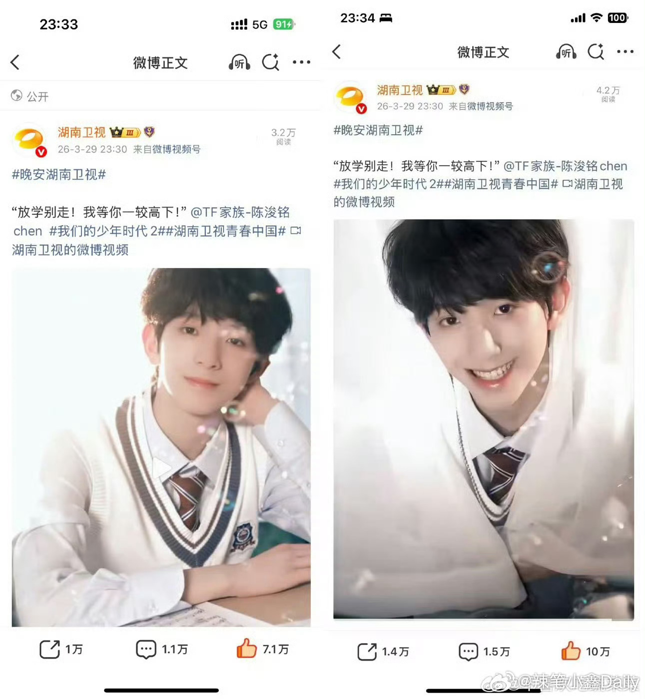陈浚铭谢逸舟 陈浚铭湖南卫视单人宣发,3分钟万转,4分钟10w赞,5分钟1.5万