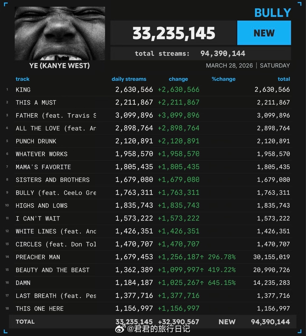 3月27日,欧美两位歌手发新专辑,Kanye West和断眉Charlie Puth,两人的新专辑在声破天Spotify首日播放量分别为3323万和238万