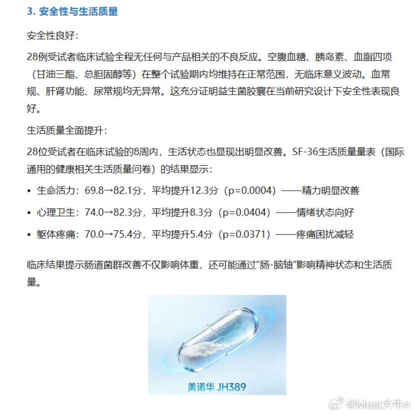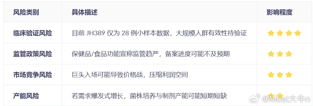 缺点/风险:减重效率:8 周减重 3.20%,远低于注射类 GLP-1(12-24 周减重 8-15%)。适合轻中度肥胖,不适合重度肥胖。监管属性:目前按保健品/食品申报,不能宣称治疗功效,市场教育成本仍存在。长期数据:目前仅为 28 人小样本、8 周数据,长期有效性和菌株稳定性需大规模验证。