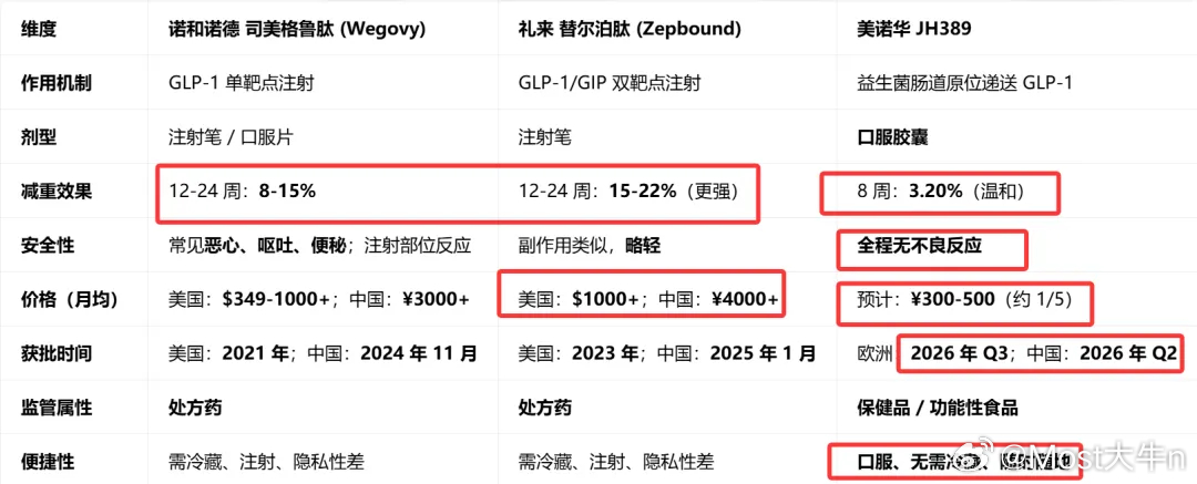 优点:安全性高:临床数据显示无不良反应,无恶心呕吐等胃肠道副作用。便捷性强:口服胶囊,无需冷藏,无需注射,隐私性好。成本低:预计月均成本低于注射类药物的 1/5。