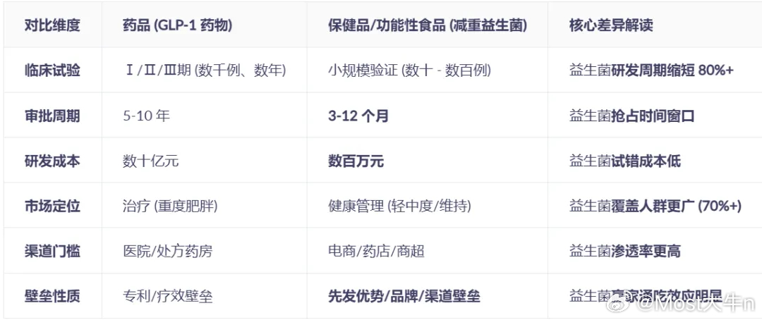 追捧原因:GLP-1 认知普及:司美格鲁肽等药物教育了市场"GLP-1=减肥”,但高昂价格和副作用劝退了大量人群。健康意识升级:消费者从“快速暴瘦”转向“长期健康管理”,益生菌兼具“减重 + 肠道调理”双重属性,符合天然、安全趋势。政策与准入:相比药品,保健品/功能性食品的审批周期短,上市速度快。