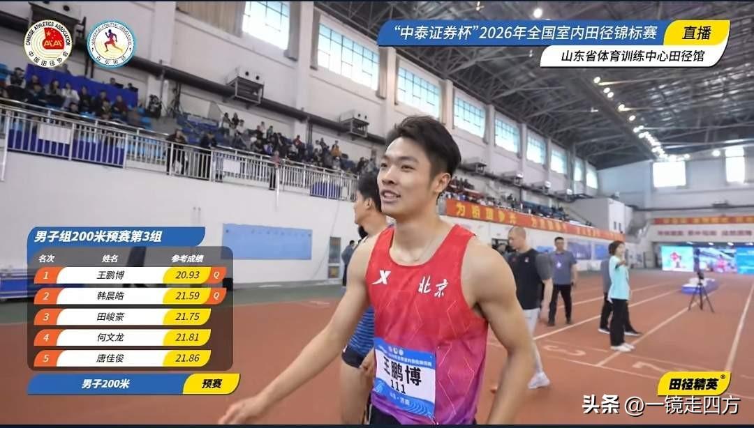 在济南进行的全国室内田径锦标赛进入收官日,又一项好成绩诞生,20岁的北京小将王鹏博在男子200米决赛以20米89的个人最好成绩夺冠,这个成绩位列亚洲历史第三位,仅次于日本选手伊东浩司在1999年创下的20秒63的亚洲室内纪录和他的北京队前辈张培萌保持的20秒75的全国室内纪录,昨天收获了女子1500米冠军的云南名将吴洪娇又在800米比赛拿到第二金,河南选手马忠强获得男子400米冠军,吉林选手罗家骏获得男子三级跳远冠军。