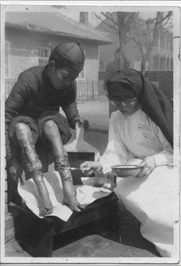 1938年,教会医院的户外,一位修女正俯身专注地为一名麻风病男孩处理腿部溃烂的伤口。 男孩穿着厚实的棉衣棉裤,戴着瓜皮帽,蜷坐在木凳上,双腿赤裸着搭在铺了白纸的矮凳上——他的小腿布满触目惊心的溃疡与结痂,皮肤溃烂、组织坏死,他低着头,沉默地凝视着修女的动作,没有哭喊,只有被病痛与战乱磨平的顺从。 修女身着洁净的白衣,头戴修女头巾,戴着圆框眼镜,神情肃穆而温柔。她一手端着金属药碗,一手持着棉签,正小心翼翼地为男孩清理创面,动作轻柔得仿佛怕惊扰了这脆弱的生命。在那个将麻风病视为“恶疾”、患者被驱逐隔离的年代,她的双手没有丝毫退缩,只有跨越种族与偏见的悲悯。