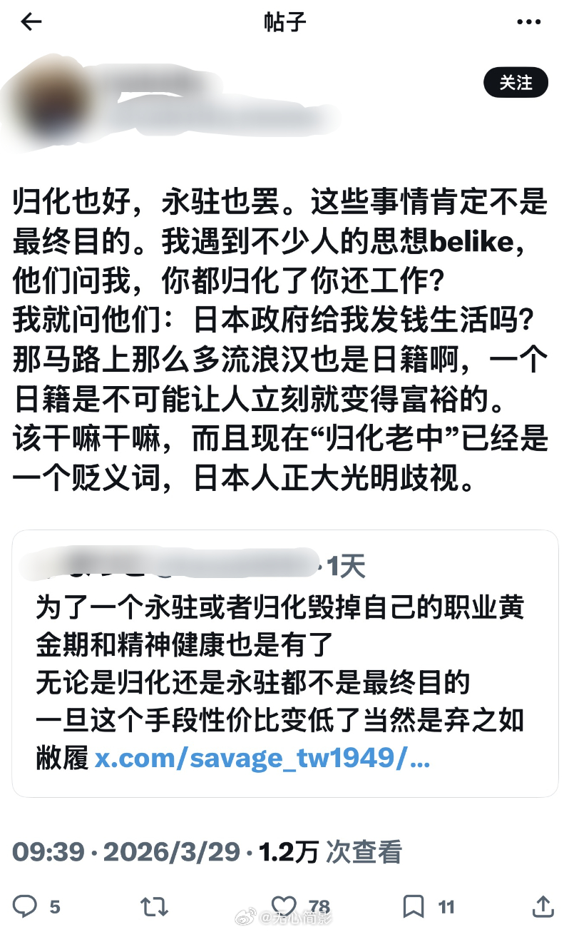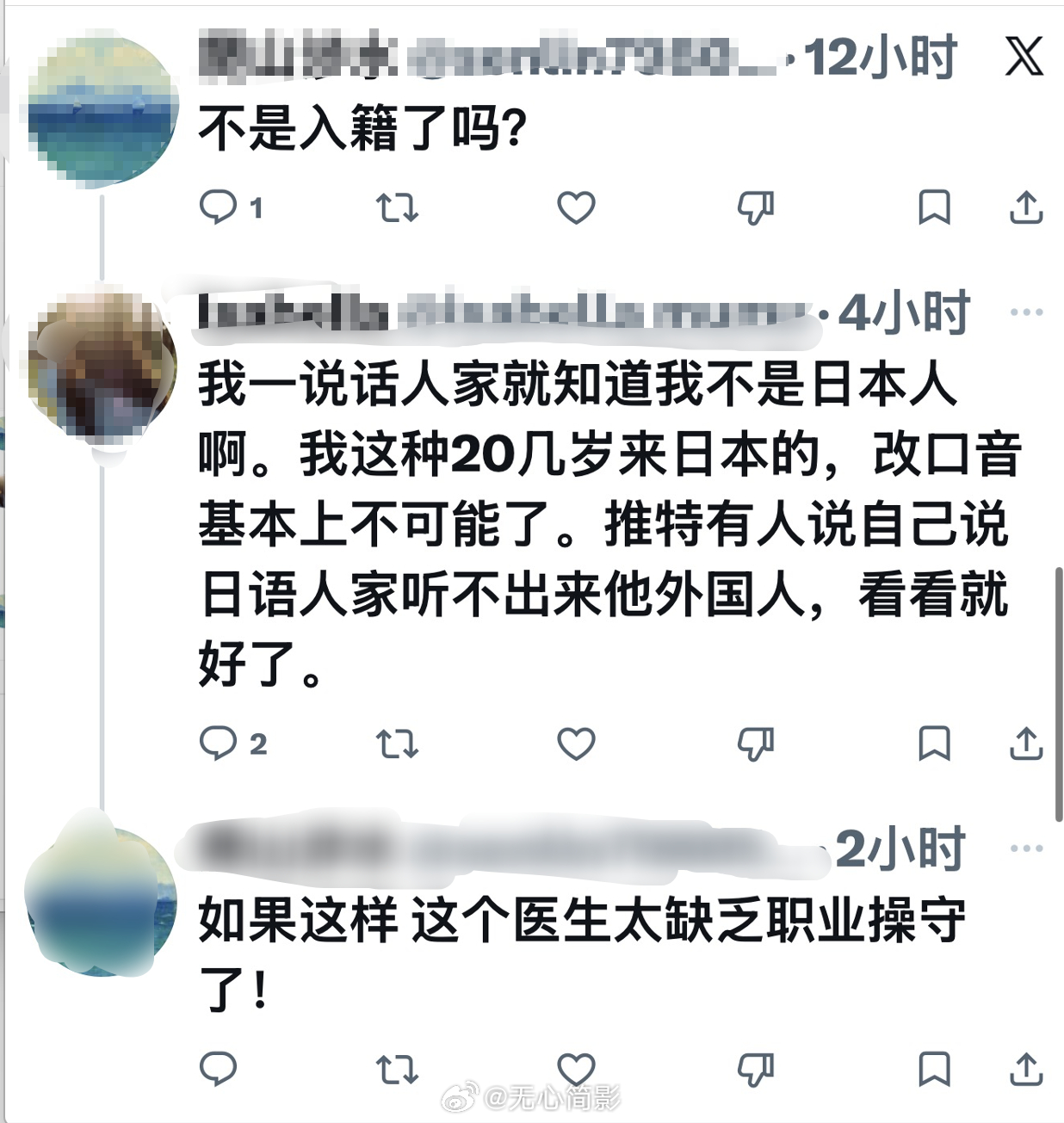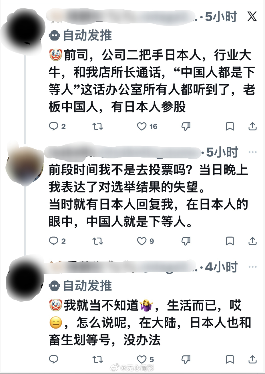 推特上看到在日华人吐槽日本社会对中国人的歧视,并表示“归化老中”在日本已经是个贬义词,“日本人正大光明的歧视”——甚至在中国人开的公司里,日本二把手都敢说“中国人是下等人”这种话。这位网友说的挺好的,不要以为日本那些排外的右翼是只敢在网上整活儿的loser,右翼思想甚至已经蔓延到医生群体里。相比下来,有人说,日本人在中国大陆也被人看不起什么的,但说实话,我真从来没有见到一个日本人吐槽过他因为是日本人,而在中国大陆受到歧视或怼脸攻击,国人对日本人的厌恶更多是在政治上的,而不是人种身份,看到是外国人,无论哪个国家,都还是要尽量保持礼貌热情的一面。但在日本,对中国人的歧视和仇视却是公开化的。去年还是前年我就说过了,日本当局鼓动下的右翼思潮,让这个国家越来越像战前的日本,还在日本经商、学习和工作的国人,还是早点做打算吧。