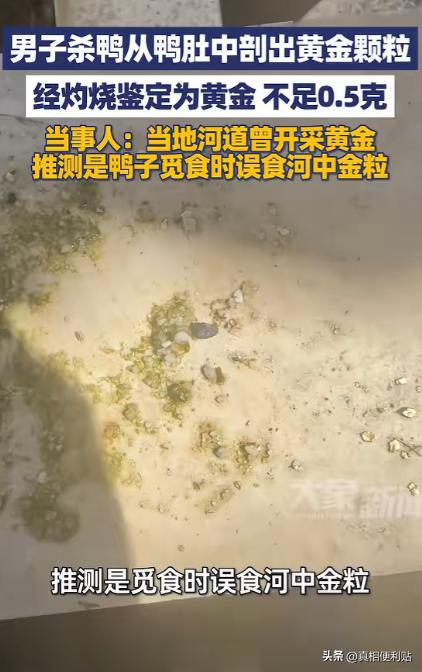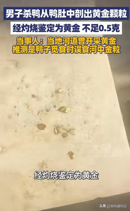 意外之喜!湖南邵阳,一男子过年时杀鸭来吃,不料在处理鸭子时,竟从鸭肚子中发现一些金色颗粒,当时男子就觉得这些金粒很像黄金。果然,之后男子将这些金粒收集灼烧鉴定后,确实是重量不足0.5g的黄金! 腊月二十八那天,湖南邵阳一个小村子里年味很足,屋后柴火噼啪响,灶房里油烟一阵一阵往外冒,村里谁家杀鸡宰鸭、备年货,基本都赶在这两天。 老张家也忙得团团转,亲戚要来拜年,他想着把自家散养了大半年的土鸭收拾出来,炖一锅热乎的,端上桌也算体面。 老张干这些活很熟,拔毛、开膛、清洗、剁块,一套流程做得顺手,直到他剪开鸭胃,把里面的草渣、沙粒倒出来时,指尖碰到几颗硬东西,触感不像骨头,也不像石子——小小一粒,却特别“实”。 他下意识把那几粒捏出来,拿水冲干净,冲完以后,掌心里躺着几颗米粒大小的颗粒,颜色偏金黄,不是那种亮得晃眼的金光,而是带点温润的黄。 老张用手指轻轻一掂,第一感觉就是:怎么这么压手?同样大小的沙石,没这个分量。 “不会是金子吧?”他嘴上这么说,其实自己也不敢确定,媳妇听见动静凑过来,低头看了一眼也愣住了。 两口子都没往外喊,先把东西放在盘子里,反复看了几遍:颗粒表面不太规则,有点像自然磨出来的砂金,边缘圆润,贴着皮肤也不扎手。 鸭子是散养的,平时就在村边的河滩、田埂上转悠,鸭子爱啄水草、捡小虫,还会吞一些细沙小石头来帮助磨碎食物,这是常见习性。 老张以前也见过鸭胃里有小石子,所以一开始并没太在意,直到这回摸出来的东西,颜色和重量都不对。 为了心里有个底,老张找了个镊子把颗粒夹住,又拿打火机烤了一会儿,这个做法其实也就是土办法:有些金属遇热会变黑、会氧化、会有异味,但黄金相对稳定,不太容易出现明显变化。 火烧过后,颗粒冷下来还是那个颜色,没起皮、没发黑,老张才松了口气,觉得八九不离十。 消息最后还是传开了,农村就这样,家里出了点新鲜事,左邻右舍很快就知道,有人跑来看热闹,有人拿手电照着看,有人笑着说“以后杀鸭子得仔细点,别把‘彩蛋’倒垃圾桶了”。 也有人开玩笑更直白:“这鸭子比人还会淘金。” 大家最关心的还是:这东西从哪来的?老张想来想去,觉得八成和那条河有关。 村里老人也说过,早些年有人在河里捞过一点砂金,规模不大,没捞出什么大名堂,但河床的沙层里可能一直零星残留着细小金粒。 鸭子天天在浅滩边活动,啄食、吞沙的时候,把混在沙里的金粒一并吞下去,也不是完全没可能。 从常识来说,鸭胃里会积一些难消化的东西,像小石子、硬壳类残渣;而黄金的化学性质比较稳定,不容易被胃酸“吃掉”,小颗粒进入胃里后,可能会在一段时间里停留。 至于能不能“越攒越多”,一般还是看摄入量、颗粒大小和是否随食物排出——这次算是碰巧让人撞见了。 值多少钱其实并不夸张,几粒加起来不到半克的话,按金价折算也就是几百块上下,但老张两口子没把它当发财的路子,也没想着拿去大张旗鼓卖钱。 他们更愿意把这事,当作过年的一个小彩头:赶在年前发现点“金光闪闪”的东西,听着就吉利,饭桌上也多了个能聊的故事。 后来这事传到网上,评论区照例热闹:有人说羡慕这种“土味好运”,有人说以后杀鸡宰鸭都要翻翻砂囊胃,别错过;还有人调侃“河神发年终奖了”。 玩笑归玩笑,大家都明白,这种事不可能复制,顶多算生活偶尔给的一点小惊喜。 老张家第二天照样忙年,照样洗菜做饭,鸭子也照常养,只不过从那以后,村里人处理禽类内脏时都会多看两眼——不是指望发财,而是被这件事提醒了一下。 有时候你以为只是普通的一堆沙石,里面还真可能夹着点意外的小东西,生活的光亮不一定大,但来得刚好,也足够让人记很久。我要上精选-全民写作大赛 信源:大象新闻2026-02-26——《2月26日(消息)湖南邵阳,男子杀鸭竟从鸭肚中剖出黄金颗粒,经灼烧鉴定为黄金 重量不足0.5克……》