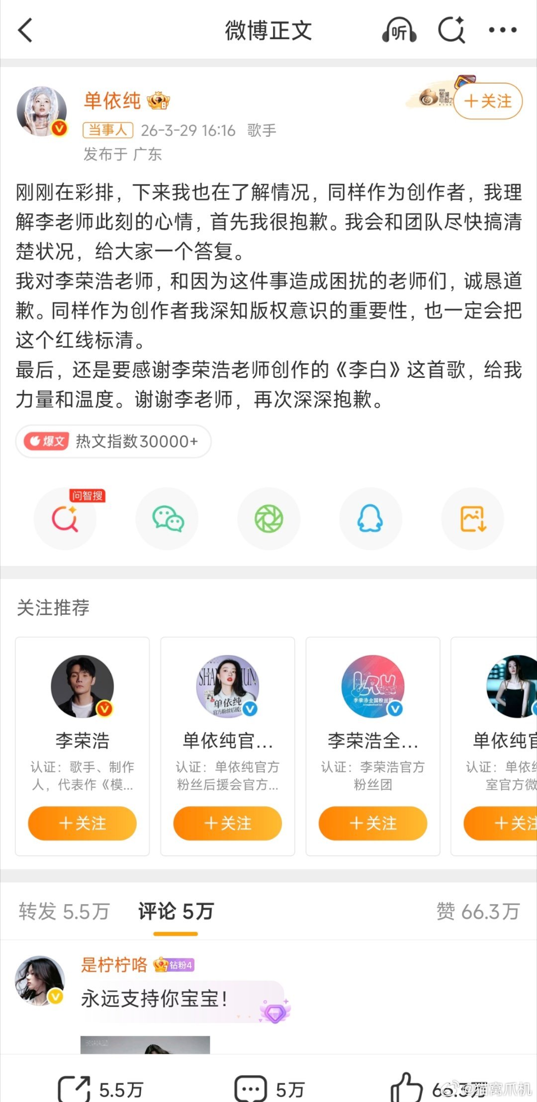 很多音评人说改编得好,我只觉得改编得没有文化。李荣浩 单依纯强行侵权