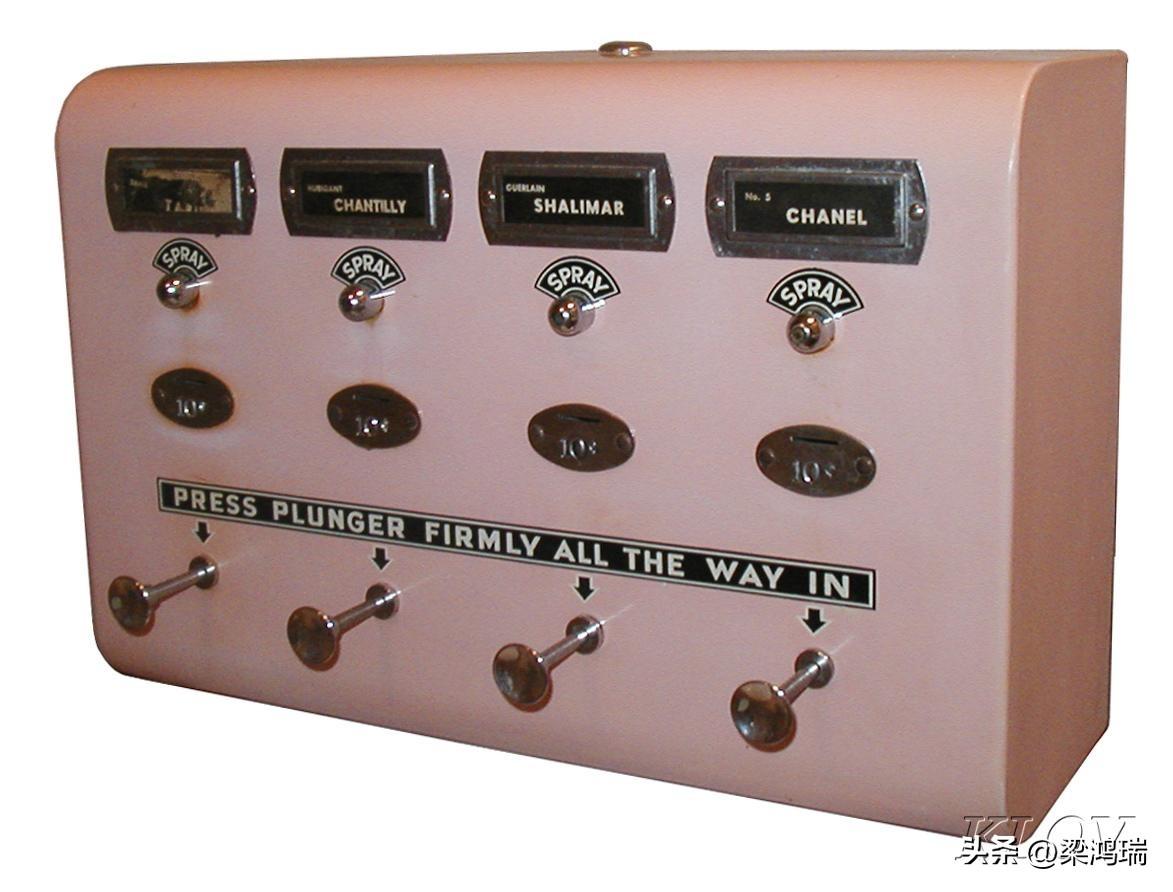 这张图片展示了 1952 年的一种香水自动售货机。 关于这款自动售货机 这种机器在 20 世纪 50 年代主要安装在女士洗手间、高档酒店或剧院中。 使用方式: 顾客只需投入 10 美分(一角硬币),机器就会喷洒一次香水。 香水选择: 机器通常提供当时流行的品牌供选择,如 Chanel(香奈儿)、Tabu、Tweed 等。 名称: 这种设备有时被称为 "Perfumatic"。 图中的女士正在操作机器,选择她心仪的香氛。画面呈现了 20 世纪中期特有的生活方式和审美风格。 这款 1952 年的香水自动售货机(名为 Perfumatic)是由美国的 Mercury Steel Corp.(水星钢铁公司)生产的。 该公司总部位于美国,从 1947 年开始以 "Perfumatic" 为商品名发布了多个型号的机器。