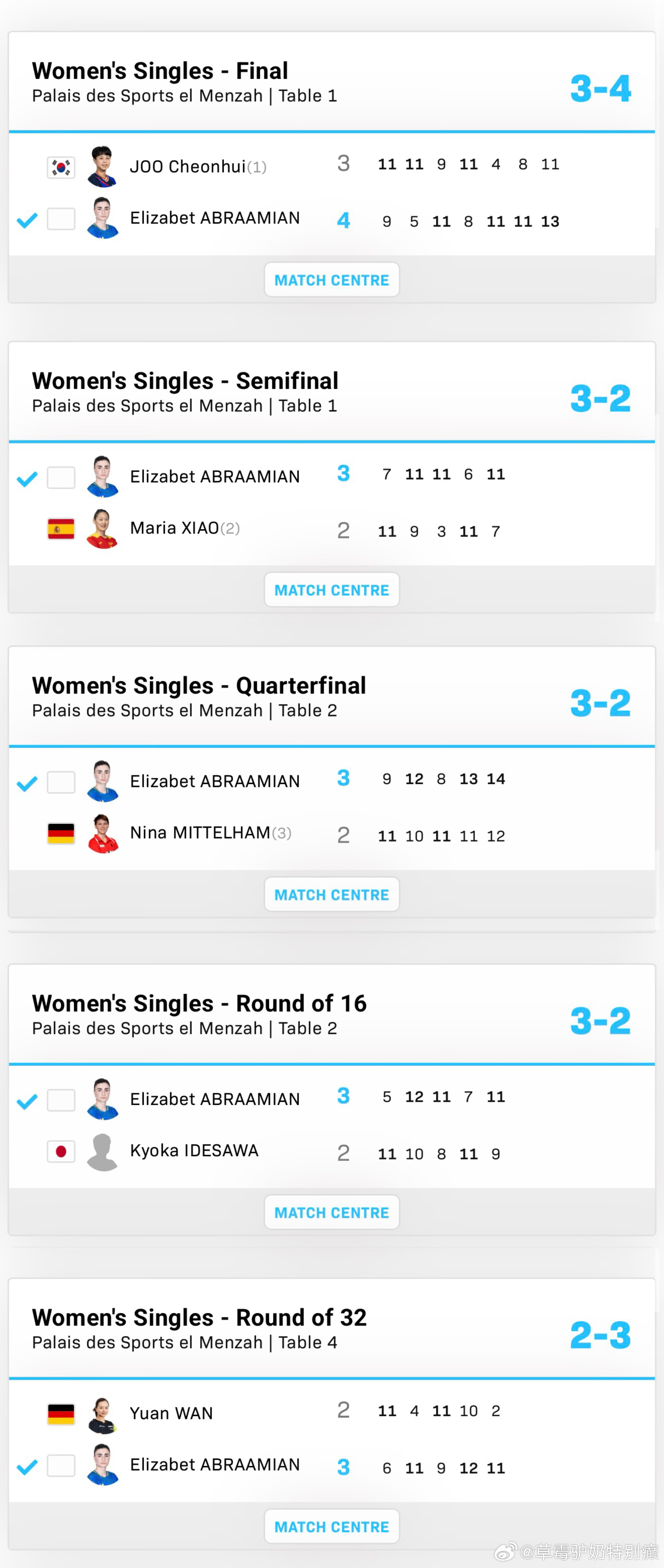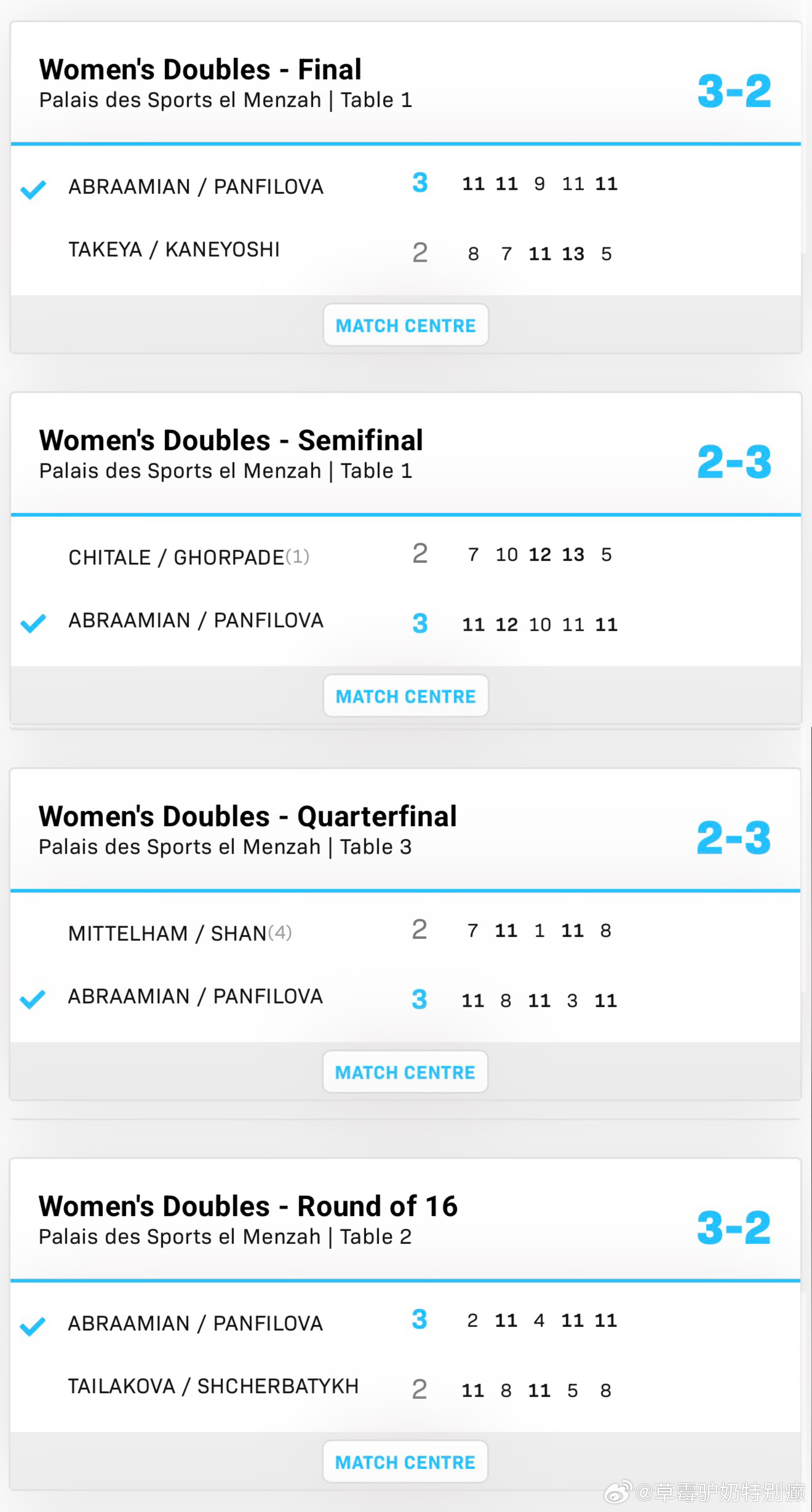 阿布拉米安在突尼斯堪称“传奇决胜王”单打双打混双一共打了11次决胜局其中10次获胜 仅在混双半决赛输给了最后的冠军罗布勒斯/肖瑶茜(她和多尔还是跨国组合第一次配合)