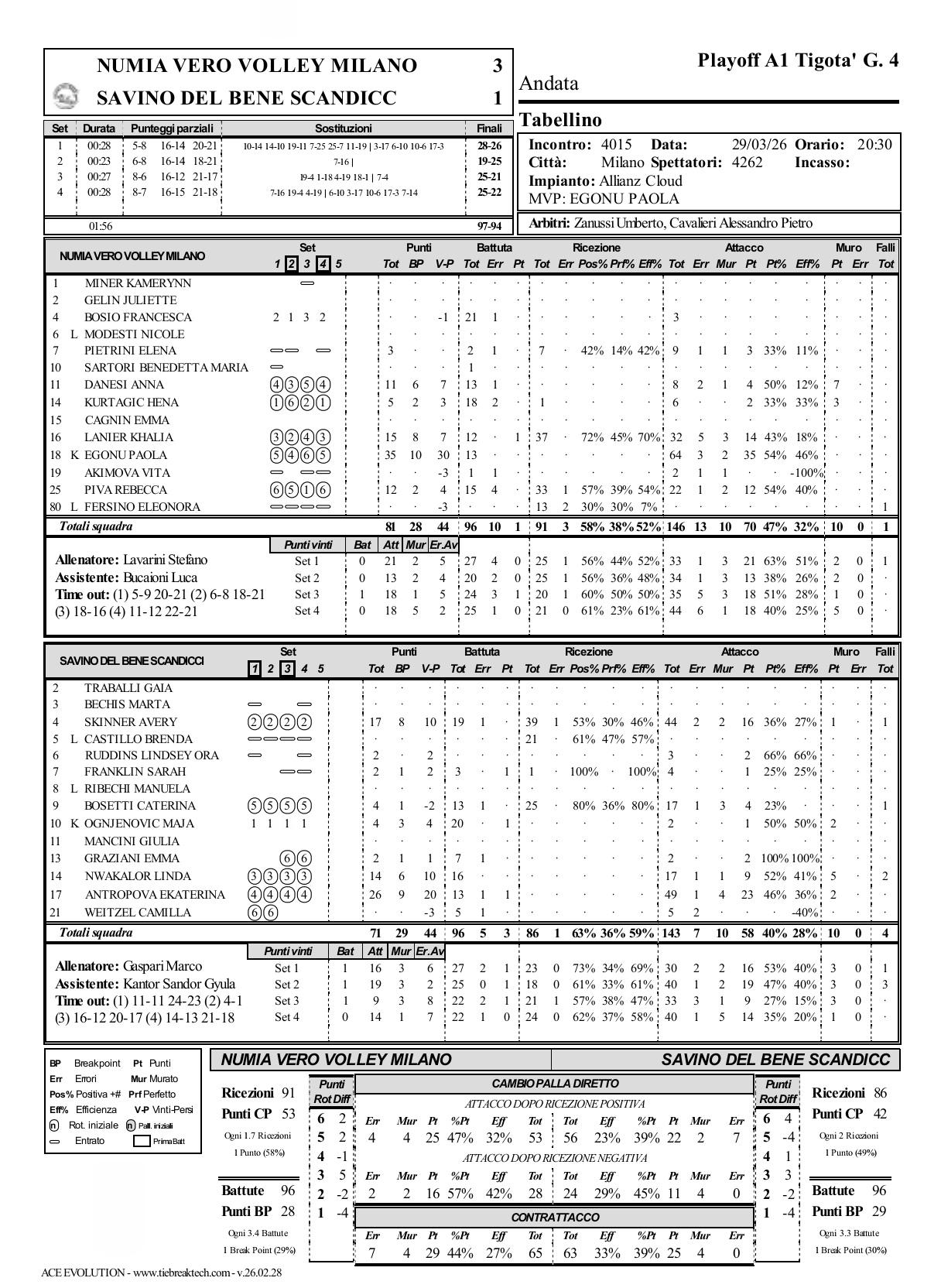 米兰淘汰斯坎迪奇进决赛 2025-2026女排意甲总决赛半决赛,米兰主场3-1战胜斯坎迪奇,比分28-26, 19-25, 25-21, 25-22,从而场分3-1淘汰对手晋级决赛。埃格努35分得分王并MVP,安娃26分。米兰将与科内利亚诺争夺本届联赛冠军。 米兰: 埃格努64扣35中3失2被拦、0拦0发35分 拉尼尔32扣14中5失3被拦、0拦1发15分 皮瓦22扣12中1失2被拦、0拦0发12分 达内西8扣4中2失1被拦、7拦0发11分 库尔塔吉奇6扣2中0失0被拦、3拦0发5分 皮特里尼9扣3中1失1被拦、0拦0发3分 博西奥3扣0中0失0被拦、0拦0发0分 阿基莫娃2扣0中1失1被拦、0拦0发0分 斯坎迪奇: 安特罗波娃49扣23中1失4被拦、2拦1发6分 斯金纳44扣16中2失2被拦、1拦0发17分 恩瓦卡洛17扣9中1失1被拦、5拦0发14分 奥格涅诺维奇2扣1中0失0被拦、2拦1发4分 波塞蒂17扣4中1失3被拦、0拦0发4分 格拉齐亚尼2扣2中0失0被拦、0拦0发2分 鲁丁斯3扣2中0失0被拦、0拦0发2分 富兰克林4扣1中0失0被拦、0拦1发2分 魏策尔5扣0中2失0被拦、0拦0发0分 米兰-斯坎迪奇: 进攻得分:70-58 拦网得分:10-10 发球得分:1-3 对方送分:16-23 总得分:97-94 一传到位率:58%-63% 一传完美率:38%-36% 意甲决战 斯坎迪奇