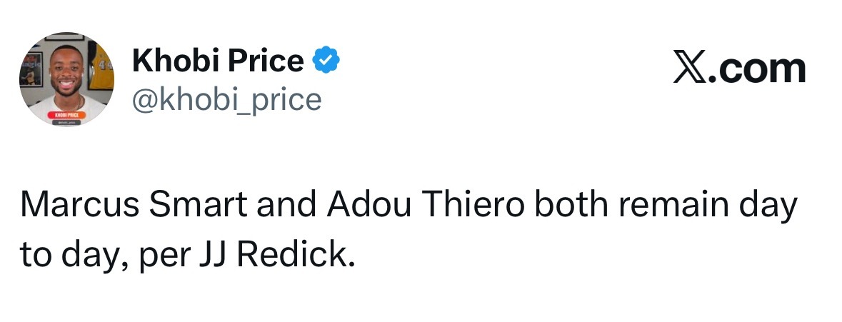 雷迪克表示,斯马特与蒂耶罗,每日观察。斯玛特右脚踝伤势缺席了近3场比赛,蒂耶罗因