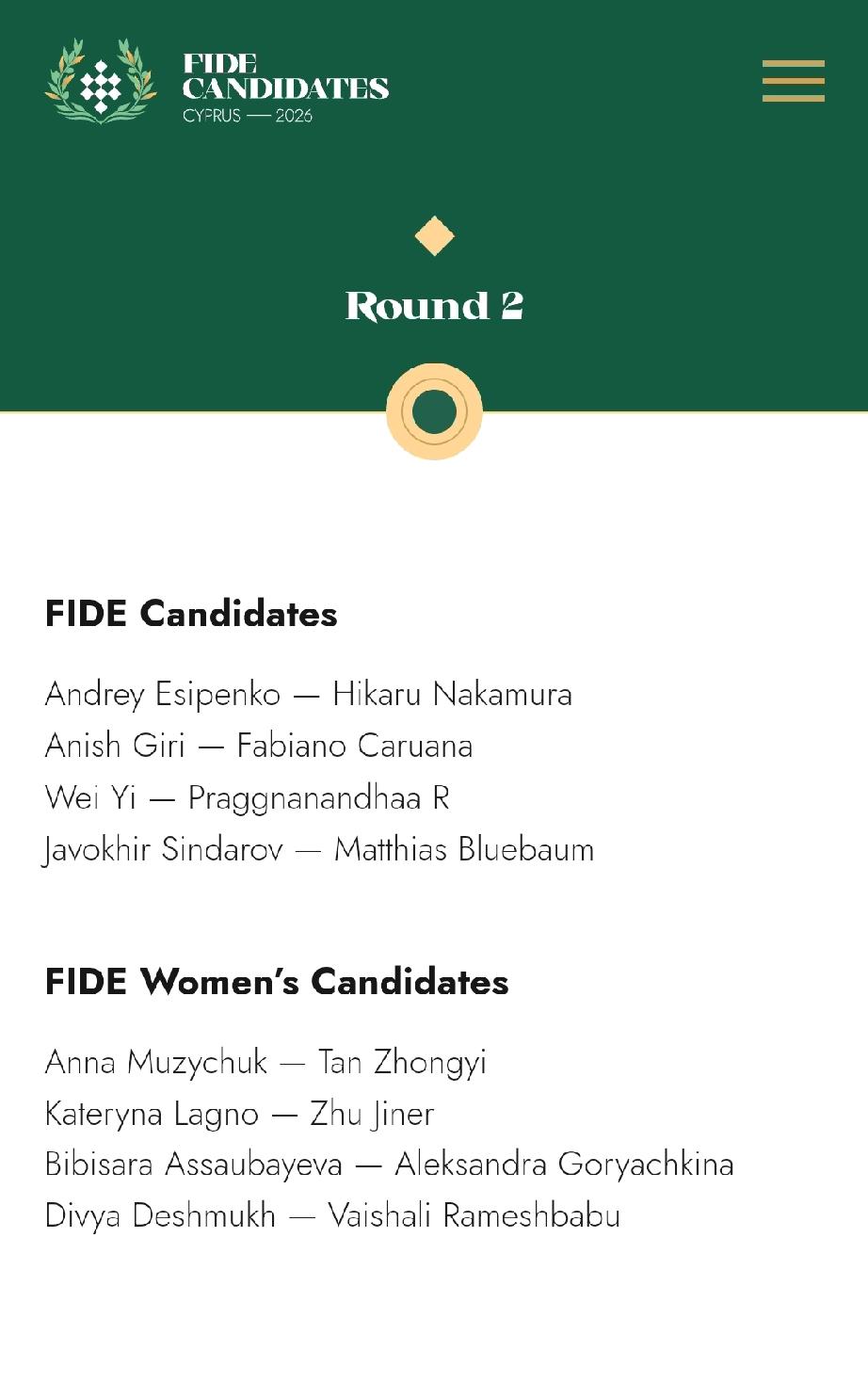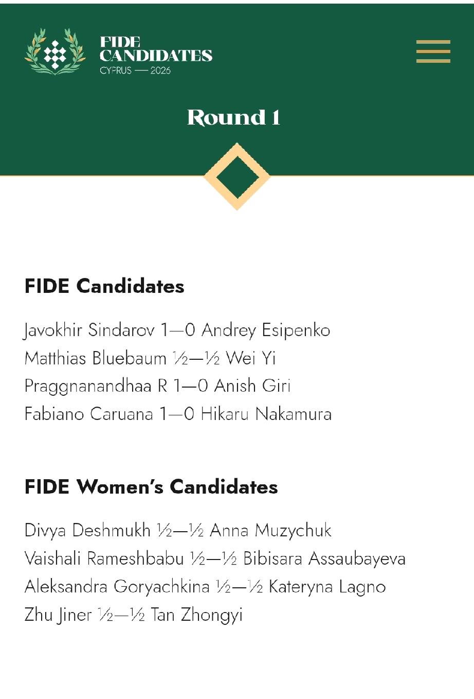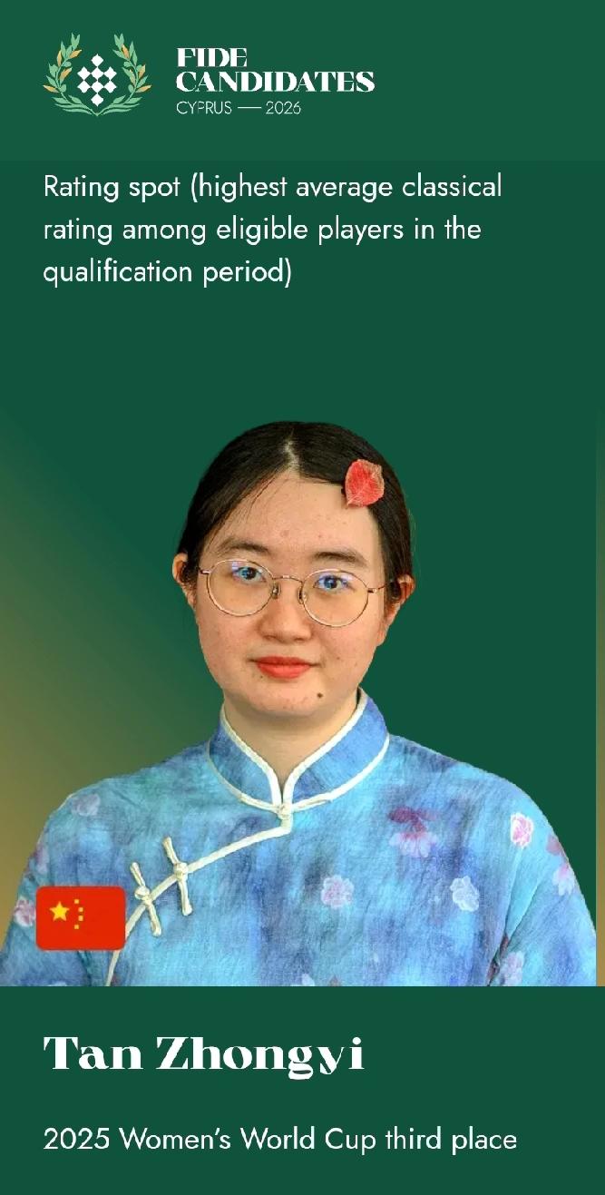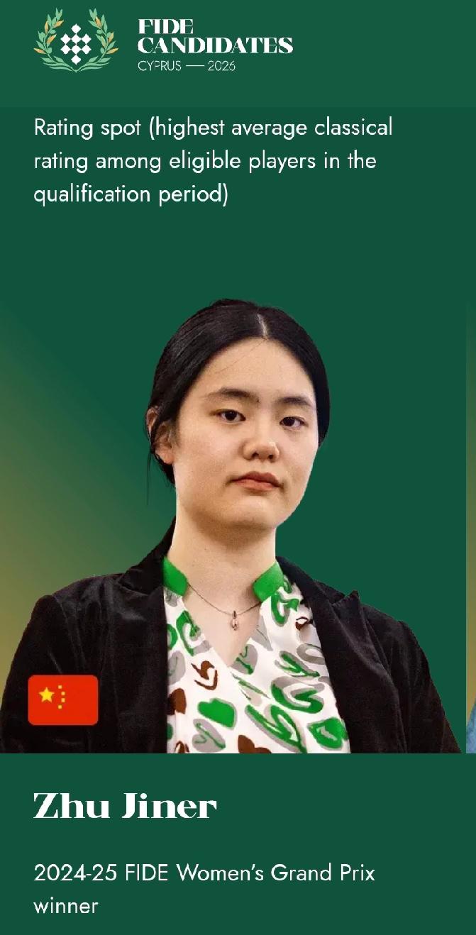 国际棋联候选人赛首轮三名中国棋手收获平局! 北京时间3月29日,2026国际棋联世界冠军候选人赛在塞浦路斯帕福斯开幕,男女各八名球员参赛,4月16日结束,冠军将有资格挑战现任世界冠军古克什和居文君。 中国棋手韦弈、谭中怡和朱锦尔参赛。 比赛采用双循环共进行14轮。 首轮比赛已经结束,结果如下: 男子组 韦弈战平布鲁鲍姆 卡鲁阿纳战胜中村光 辛达洛夫战胜埃斯彭科 普拉格纳南达战胜吉里 女子组 谭中怡战平朱锦尔 戈尔亚奇金娜战平拉诺 瓦伊莎丽战平阿萨乌巴耶娃 安娜·穆兹丘克战平德什穆克 第二轮,韦弈对阵普拉格纳南达、谭中怡对阵安娜·穆兹丘克、朱锦尔对阵拉诺。