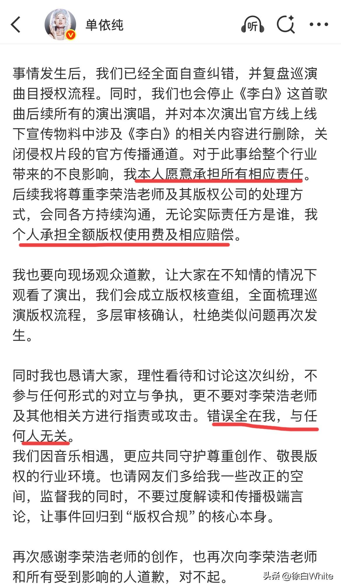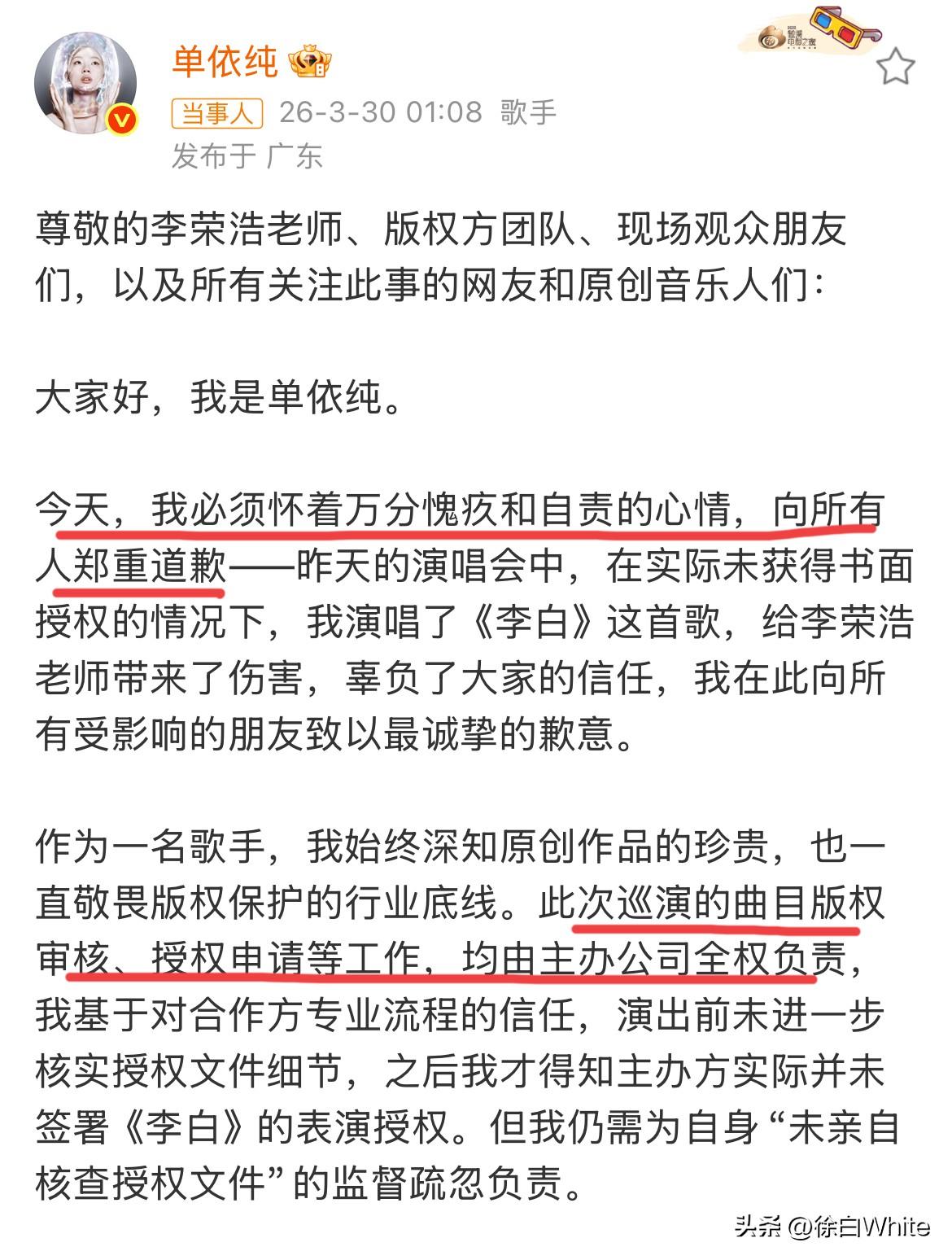 3月29日,李荣浩单依纯侵权事件大结局! 单依纯承认没拿到授权唱了《李白》,再次跟李荣浩道歉,要给钱,李荣浩不要钱! 不过,因为单依纯方有很多人攻击李荣浩,所以李荣浩保留追究的权利,如果后期不再攻击他,这事就此结束,如果后期还有人攻击他,这事没完!单依纯得约束她那边的人 这件事,自此就算大结局了,后续,单依纯大概率唱不了李白了,路人缘因这件事大为下降,李荣浩继续低调!老实人怒了一下!