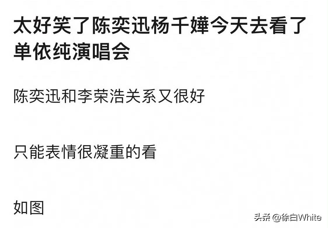 3月30日,网友发现陈奕迅昨晚出现在单依纯的演唱会现场,陈奕迅全程嘴角下弯,表情凝重,网友脑洞,陈奕迅是帮李荣浩监督单依纯的,原因是陈奕迅李荣浩关系很好! 陈奕迅的表情给我看乐了,网友觉得他是对单依纯生气,实际上有没有可能他发现了网友在拍他,是对拍摄的网友生气[捂脸] 一码归一码,陈奕迅应该不会因为李荣浩单依纯的事特意来一趟演唱会,他们这位置肯定是被邀请的,事情发生在昨天下午,看演唱会的计划肯定在昨天下午之前,陈奕迅肯定知道线上的事,但不至于说特意来监督单依纯,没必要……[笑哭]