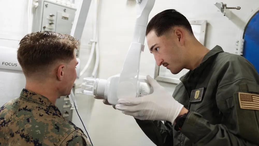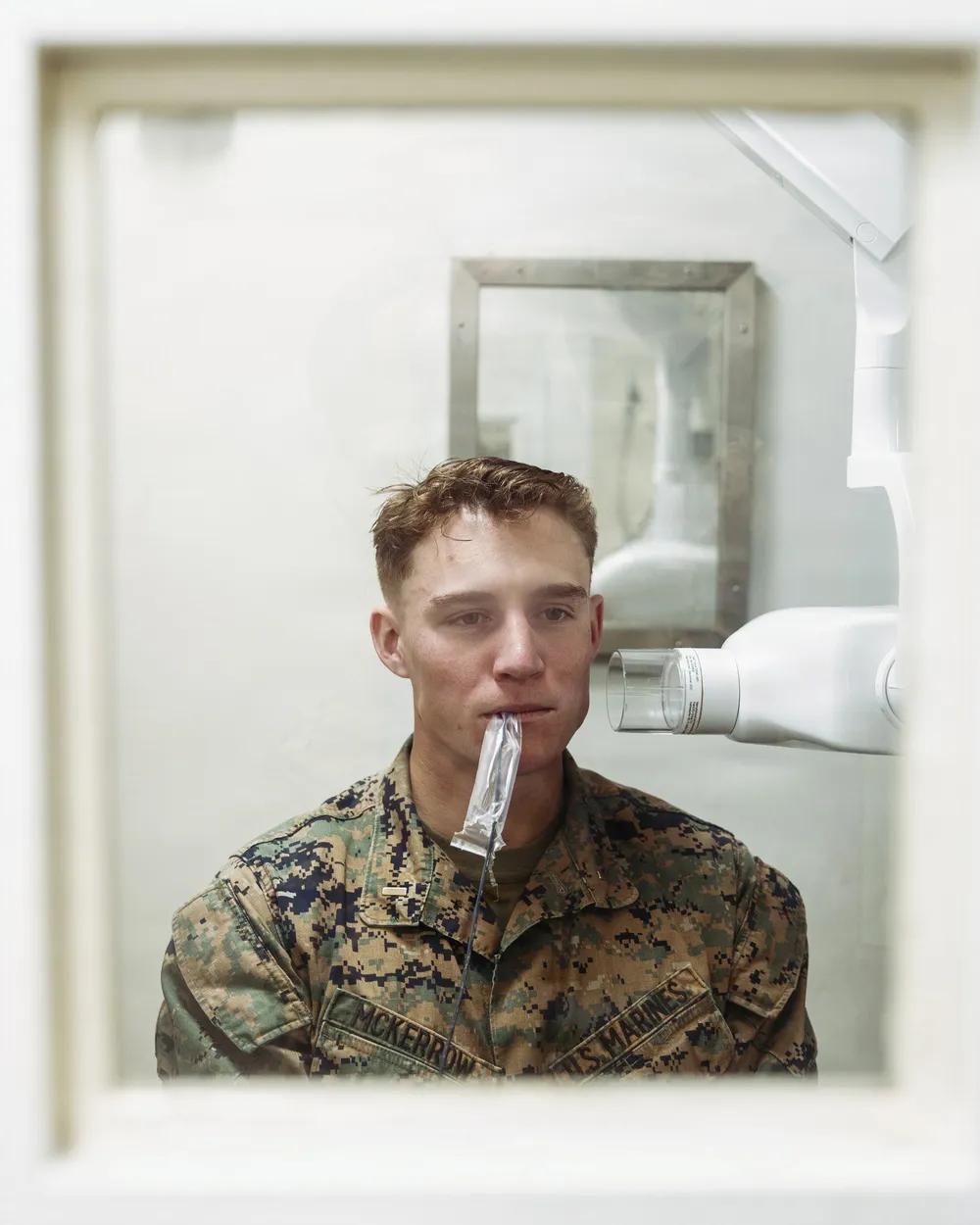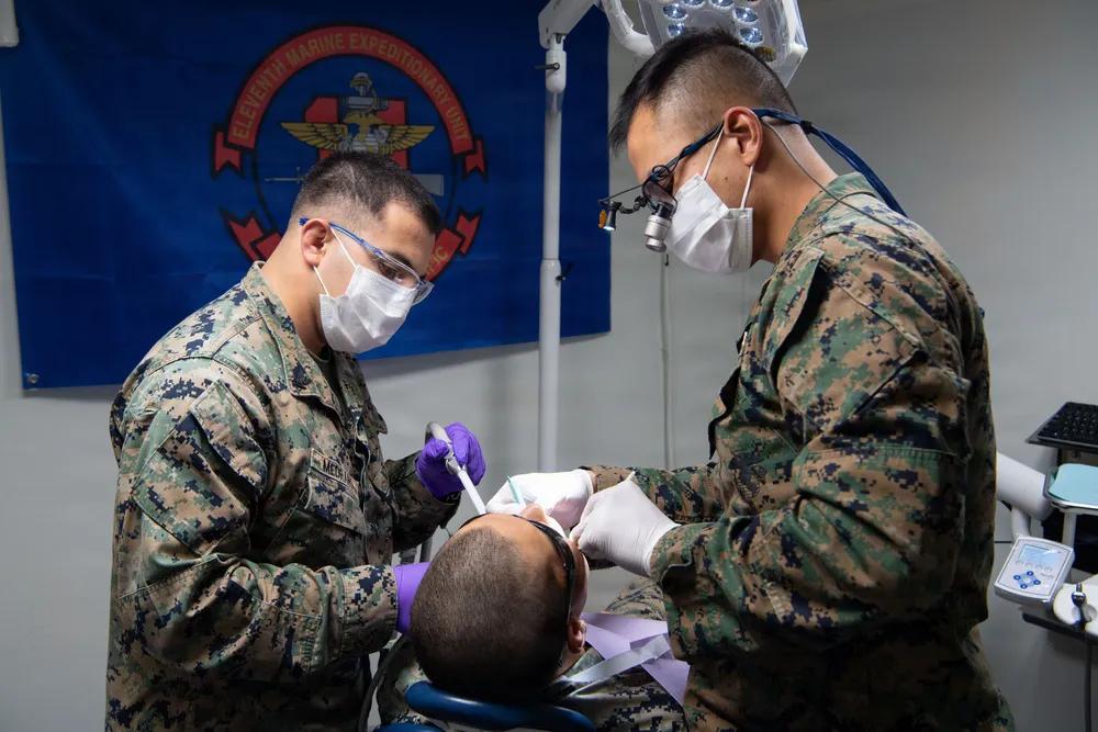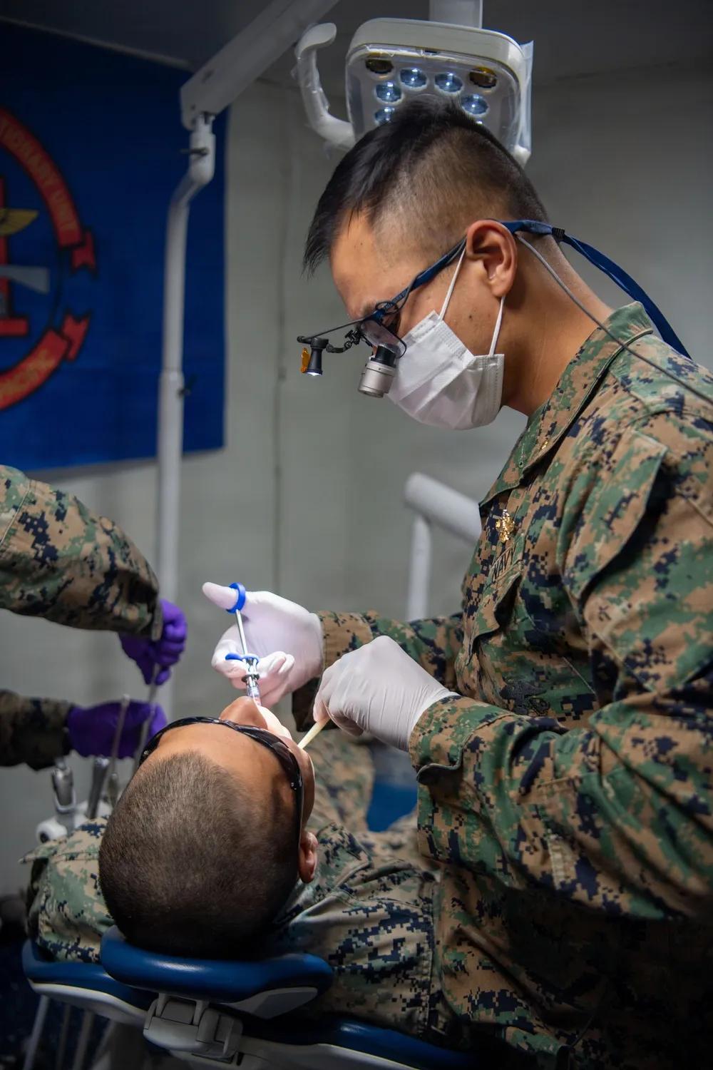 几乎每一艘大型美军舰艇都配备有牙科诊所,牙科军医。 2026年3月24日,太平洋,美国海军医务兵,隶属于第11海军远征部队第11战斗后勤营,在黄蜂级两栖攻击舰“拳师号”(LHD 4)牙科手术室为第11海军远征部队士兵进行牙科手术。 拳师号作为拳师两栖准备群旗舰,随第11海军陆战队远征部队在美国第三舰队作战区航行。