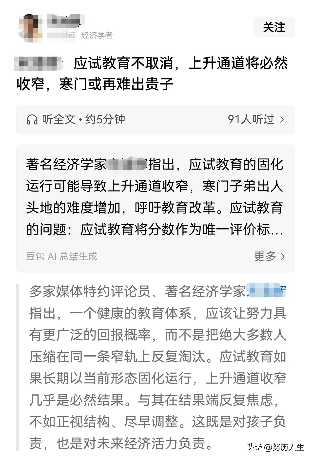 网上这位所谓的著名经济学家太辛苦啦!无时无刻不在声嘶力竭地推快乐教育,作为普通老百姓问你几个问题可以吗?都自封著名经济学家了,这点胸怀和格局应该有吧! 经常关注教育话题的网友都能发现,这类鼓吹快乐教育的声音在网络上越来越多,尤其是一些顶着经济学家、学者头衔的人,靠着专业身份背书,不断向普通家长灌输减负、躺平、不必内卷的理念。他们在公开演讲、短视频里反复强调,孩子的童年不该被试卷和补习班占据,应该尽情玩耍,不必为了成绩过度焦虑。这套说辞听起来充满人文关怀,却完全脱离了普通民众的真实生活。这些发声的专家大多拥有稳定的高收入,子女从幼儿园开始就能享受优质教育资源,还能通过海外升学、特长培养等方式避开激烈的应试竞争,他们站在优越的位置谈论教育,根本无法理解普通家庭的真实无奈。 现实生活里,绝大多数工薪家庭没有为孩子铺路的资本,父母每天奔波于工作和家庭之间,收入仅能维持日常开销,买不起优质学区房,报不起高价私教,更没有能力为孩子规划多元化的发展道路。对这些家庭来说,升学依旧是改变孩子命运最公平的路径。没有家世背景,没有资源加持,孩子只能依靠自身努力,在学业上拼出一条出路。很多家长逼着孩子学习,并非不近人情,而是清楚底层孩子的试错成本极高,一时的放纵很可能换来一生的被动。这些鼓吹快乐教育的专家从未深入基层,不了解普通家庭的生存压力,只用理想化的理论包装观点,本质上是站在云端俯视普通人的生活。 西方的快乐教育体系,本质上适配当地的阶层结构,精英阶层的子女从小接受高强度的精英教育,重视知识与能力培养,普通家庭的孩子则被引导接受快乐教育,弱化竞争意识,最终造成阶层难以跨越。这位经济学家无视国内外教育环境、社会结构的差异,直接照搬西方模式,一味否定应试教育的价值,忽视了教育公平对普通家庭的重要意义。这样的观点不仅缺乏现实依据,还会误导不少认知不足的家长,让他们在教育选择上陷入误区,最终耽误孩子的成长。 我们从不反对让孩子拥有快乐的童年,也认同教育应该兼顾身心健康,但快乐不该以放弃努力、牺牲未来为代价。普通家庭的孩子没有退路,没有可以依靠的先天优势,放任他们在该学习的年纪选择安逸,只会在步入社会后面临更大的困境,失去向上流动的机会。专家自己享受着优质资源带来的便利,却劝说普通家庭放弃竞争,这样的观点不仅无法解决实际教育问题,还会加剧家长的焦虑,让更多人对教育方向感到迷茫。 真正有责任感的学者,不该脱离现实空谈理念,而应该正视教育资源分配不均、普通家庭升学压力大等现实问题,从民生角度出发,探讨更贴合实际的教育方向。可以呼吁优化教育环境,减轻孩子的过度负担,也可以倡导素质教育,但不能全盘否定努力的价值,更不能用虚假的温情麻痹普通家长。教育的核心是给更多人公平的机会,而不是让底层孩子放弃竞争,安于现状。 读书考试或许不是成功的唯一路径,但对绝大多数普通孩子来说,这是最容易抓住、最公平的机会。我们尊重不同的教育理念,但反对脱离现实的空谈,更反对站在既得利益的位置上,误导普通家庭的选择。真正的教育思考,应该扎根于现实生活,兼顾不同阶层的需求,而不是用空洞的快乐教育,掩盖社会现实的差异。 各位读者你们怎么看?欢迎在评论区讨论