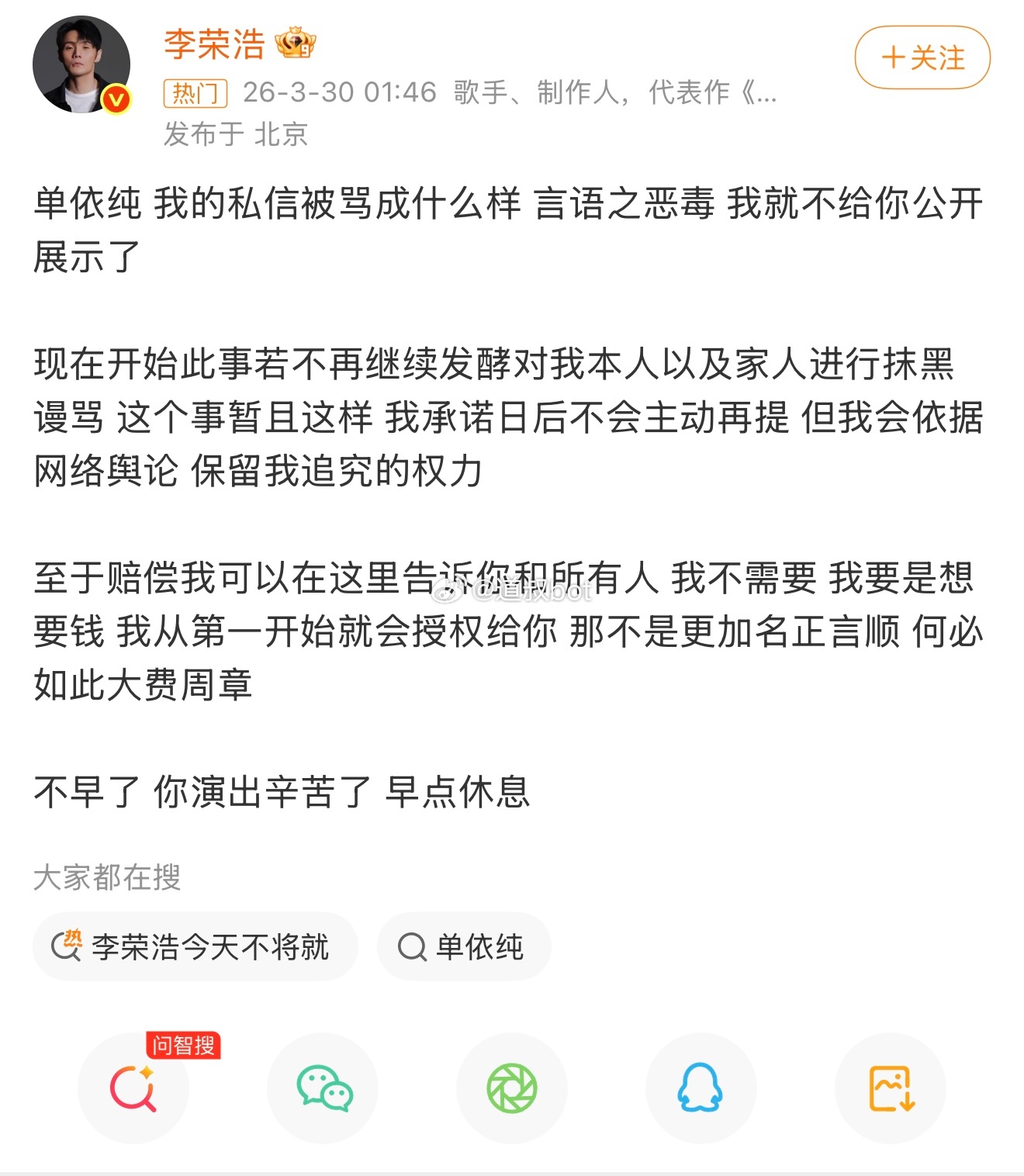 如果我是单依纯的话,直接去找李荣浩倒个歉,单依纯年少成名太顺了。人狂有祸,上一个那么狂的人是文章,大好前程做没了,不要认为这是小事。