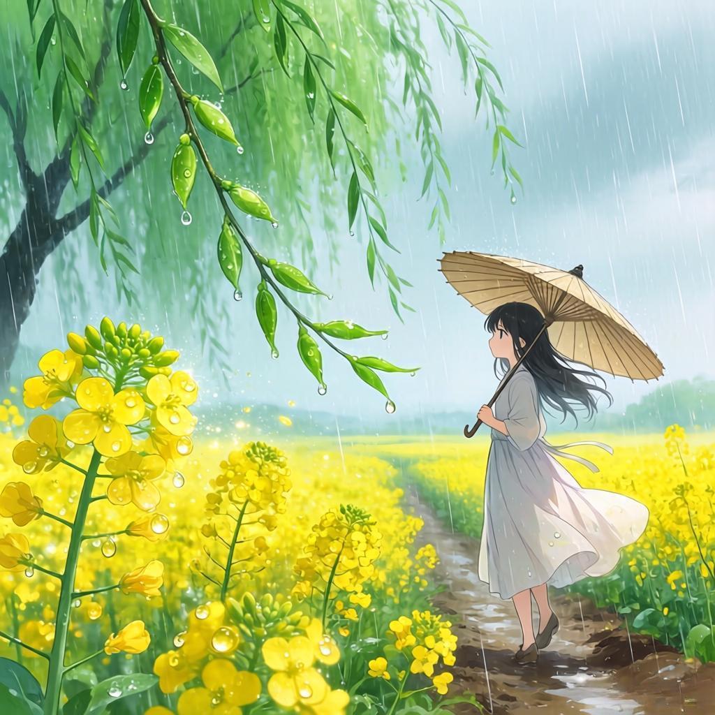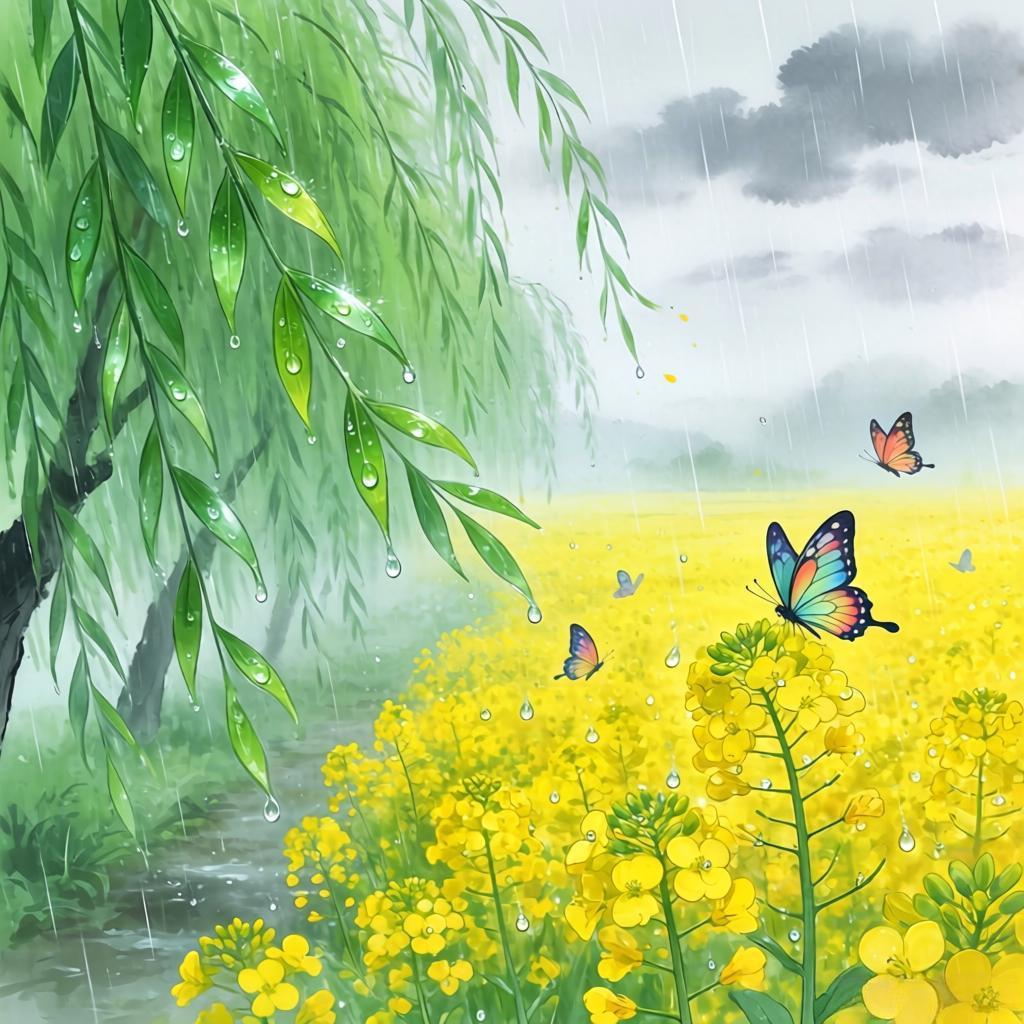 上联:风拂绿柳千枝醉 下联:雨润油菜一路香
