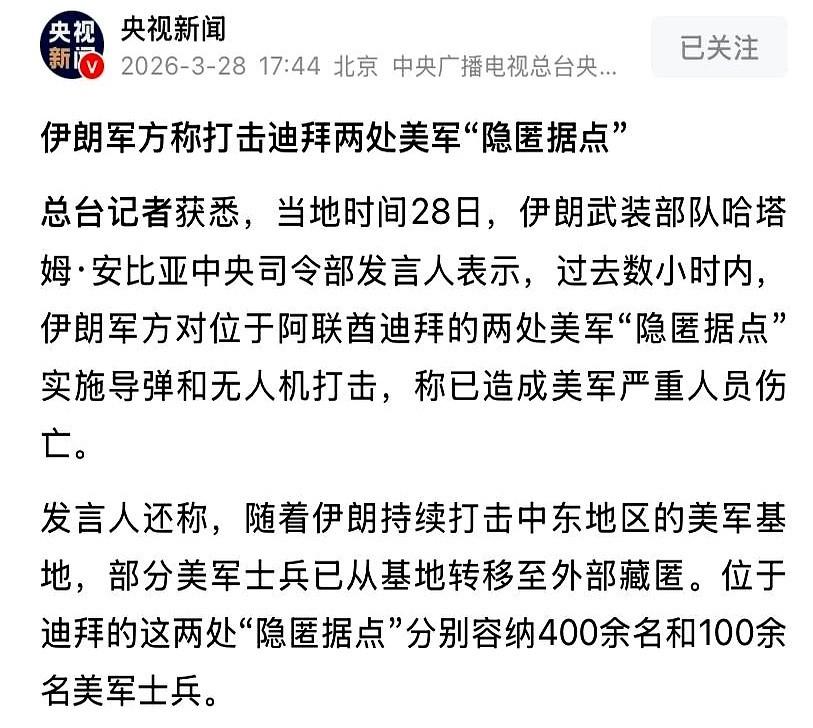 凌晨,阿曼湾海面,一艘美军支援舰的信号,突然就没了。 紧接着,雷达屏幕上,两架美军加油机,直接从满格信号,变成了两个消失的亮点。 但这只是开胃菜。 真正的重头戏,在迪拜。两处被美军当成“绝对隐秘”的据点,被从天而降的导弹和无人机,直接掀了顶。里面的人,根本来不及反应。 一个据点,驻了400名美军。另一个,100名。不多不少,整整500人,被一锅端。 这不是一次性的偷袭,这是一场连环的、精确到秒的“拔除”行动。从瘫痪你的海上补给线,到打掉你的空中加油能力,再到最后,直接端掉你以为最安全的陆上老巢。 整个流程,冷静得让人后背发凉。 最关键的问题来了:那些藏在城市里的据点,连窗户可能都做了伪装,伊朗究竟是怎么找到的?坐标怎么会泄露得这么干净? 这已经不是简单的军事打击了。这等于是在告诉对手一句话:别说你的航母在哪,就连你在哪栋楼里喝咖啡,我都知道。