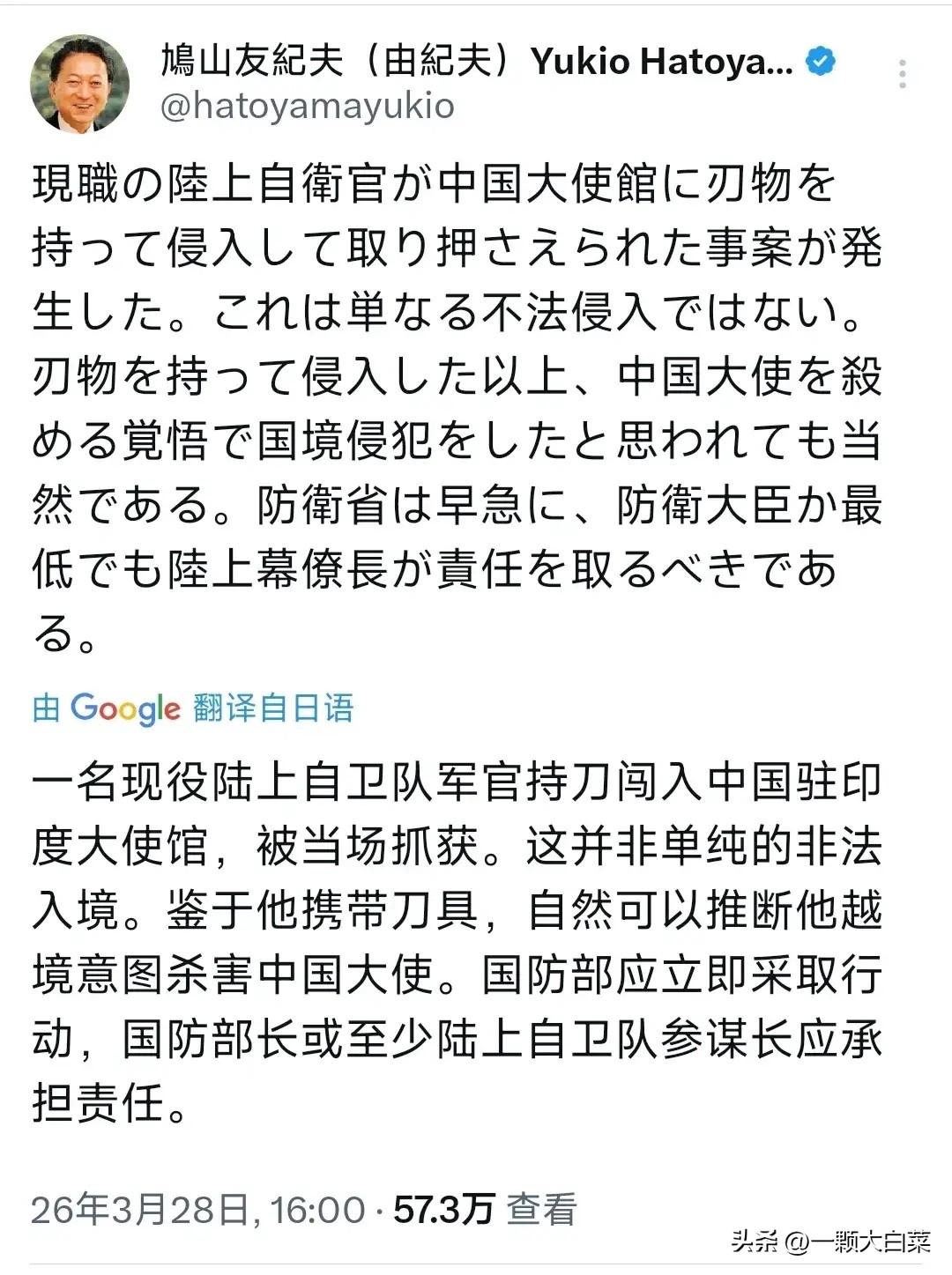 日本前首相鸠山由纪夫昨天(3月28日)写道:“一名现役陆上自卫队军官持刀闯入中国