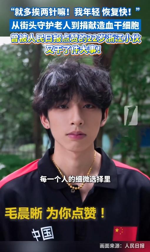 赞!22岁浙江小伙再行善举,从街头救老人到捐献造血干细胞! 近日,被人民日报点赞过的浙江小伙毛晨晰,又干了件暖心事。这个月,他在杭州完成了造血干细胞捐献,为素不相识的人搭起了一座生命之桥。 说起这小伙,很多人还记得2024年那幕:当时19岁的他在街头遇到倒地老人,没有丝毫犹豫,先用自行车护住老人,再冷静施救,那段视频被无数人转发,大家都夸这年轻人有担当。 更让人佩服的是,他20岁生日那天,不仅第一次献血,还主动加入中华骨髓库,甚至签了人体器官捐献志愿书。2025年11月,接到配型成功的电话时,他二话不说就答应了。“我输完了之后,他就能健康活着,他们全家也能有希望。”朴实的话里,满是真诚。 捐献后他在社交平台写道:“有很多普通人愿意做你们的生命搭档,好好活着。”不管是街头救人,还是病房里的生命接力,这个22岁的男孩用行动告诉我们:善良从不用轰轰烈烈,就藏在一次次温暖的选择里。 我们身边其实也有很多这样的普通人,用小举动传递着光。你见过哪些让你暖心的善举?来评论区分享,让这份温暖继续传递~ 浙江小伙两次善举引点赞造血干细胞捐献者的大爱平凡人的温暖力量 信息来源:杭州综合频道