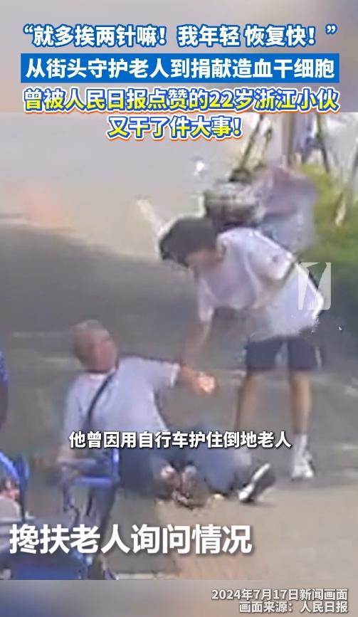 赞!22岁浙江小伙再行善举,从街头救老人到捐献造血干细胞! 近日,被人民日报