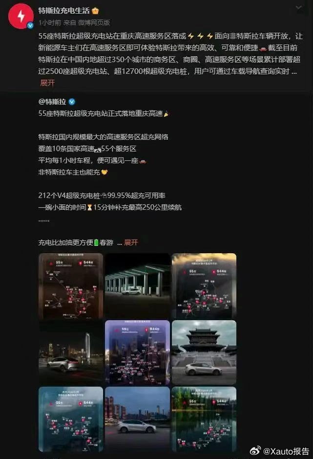 3月28日,特斯拉在重庆高速服务区建成国内最大超充网络,共55座站、212个V4桩,覆盖10条高速,15分钟可补能250公里,且对所有新能源车主开放。新能源汽车特斯拉特斯拉超充站