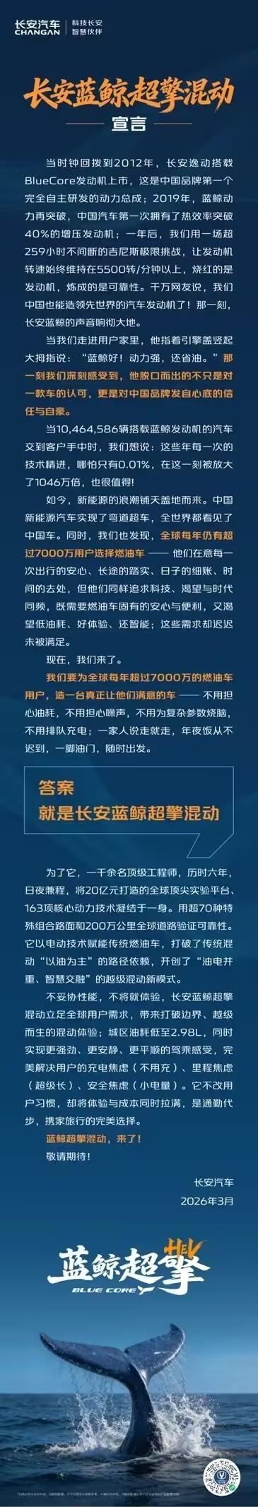 3月12日,长安汽车发布《长安蓝鲸超擎混动宣言》,明确提出以电动技术赋能传统燃油