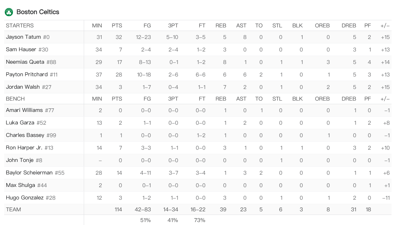 凯尔特人114-99战胜黄蜂锁定季后赛🔒塔图姆31分钟贡献32分5板8助1帽,