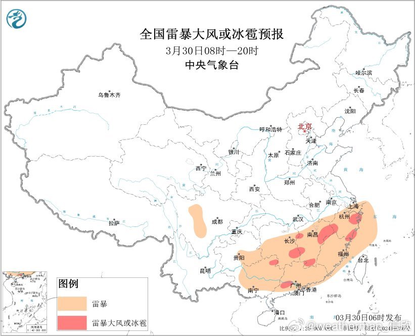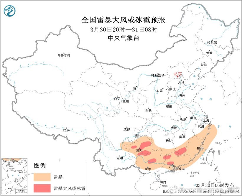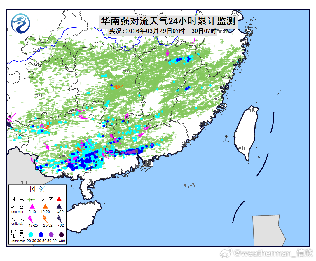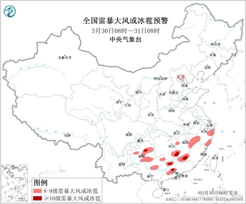 预计3月30日08时至31日08时,西南地区东部、江南中东部、华南等地的部分地区将有8级以上雷暴大风或冰雹天气,其中,湖南东南部、江西南部、贵州中东部、广东中部和西北部等地的部分地区将有10级以上雷暴大风,最大风力可达11级以上,局地不排除出现龙卷的可能性;