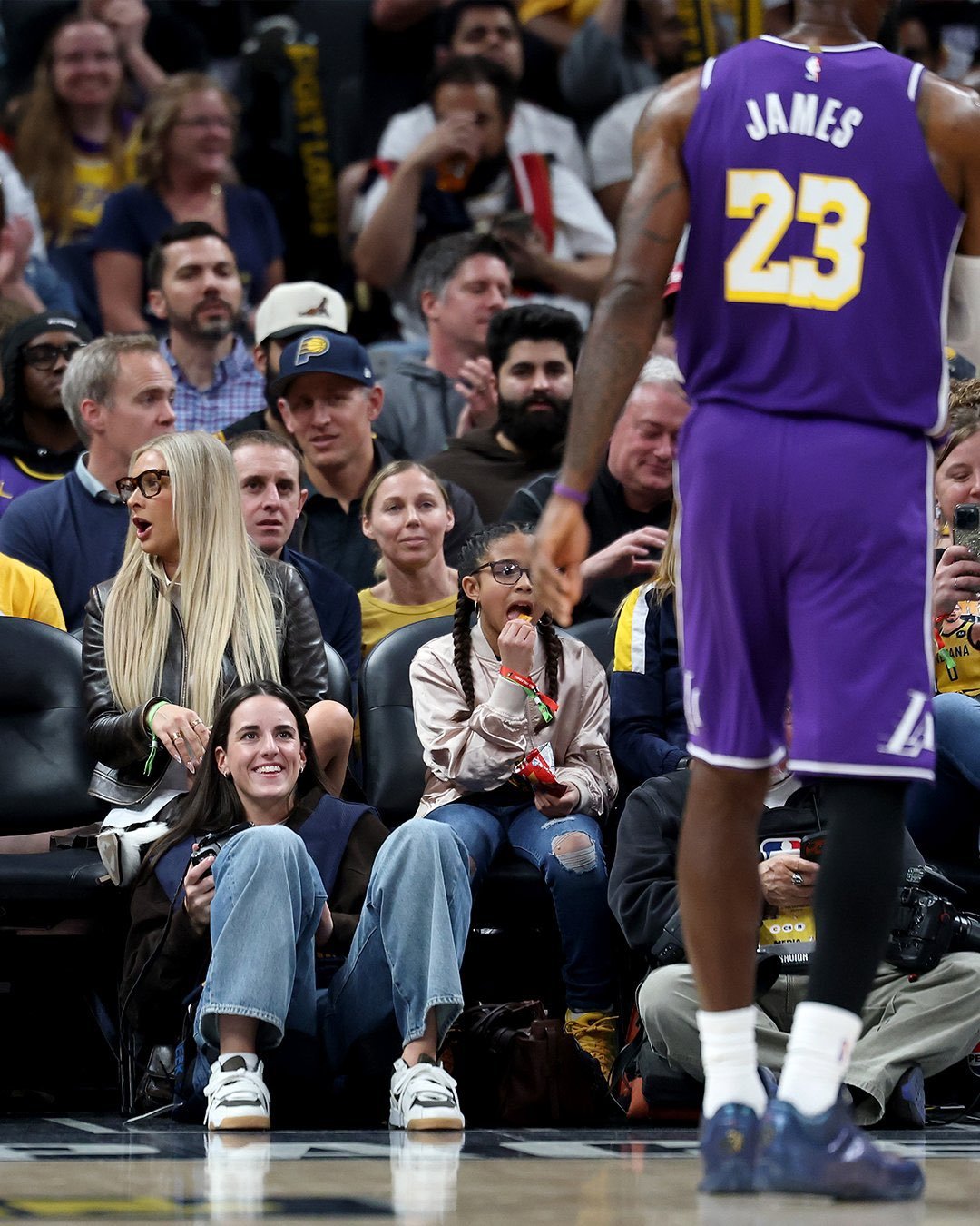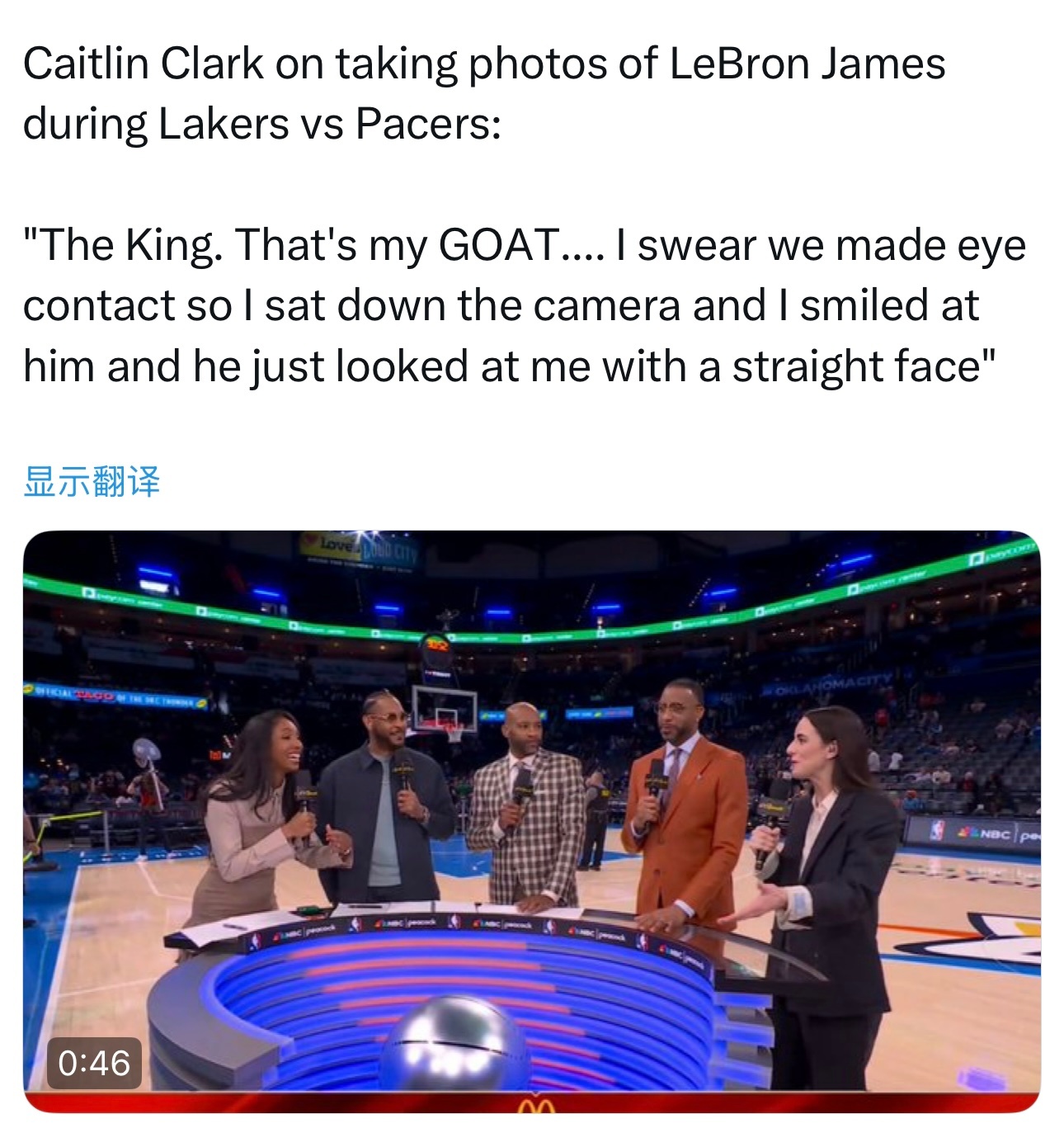 凯特琳·克拉克谈及在湖人对阵步行者的比赛中坐在场边拍摄詹姆斯一事时表示: