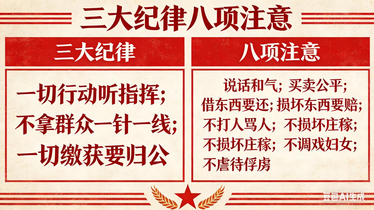 【3月30日:规矩很小,格局很大】 今年3月30日,98年前的今天,一支队伍来到湖南桂东的深山小镇,一段改变中国的朴素规矩,在这里生根发芽。 1928年3月30日,毛泽东率工农革命军到达桂东沙田。几天后他在此正式向部队颁布“三大纪律、六项注意”,后来不断完善,成为我们家喻户晓的“三大纪律、八项注意”。 没有高深口号,全是大白话、实在理: 三大纪律:一切行动听指挥;不拿群众一针一线;一切缴获要归公。 八项注意:说话和气、买卖公平、借东西要还、损坏东西要赔、不打人骂人、不损坏庄稼、不调戏妇女、不虐待俘虏。 这些都是小事,小到像家里老人念叨的“出门要有规矩”。可在兵荒马乱的年代,多少军队抢粮扰民,唯独这支队伍,把“不占百姓便宜”写进铁律、落到实处。 不拿一针一线,守的是做人的边界; 借了就还、坏了就赔,守的是人与人的信任; 买卖公平、说话和气,守的是把百姓当亲人的真心。 看似约束自己,实则护住人心。能把小规矩守死,才有大格局;能把不占便宜当本能,走到哪儿腰杆都硬。 这支队伍靠的从不是枪炮,是把百姓放在心上的诚意,最终走过万里征程,走进了新中国。 放到今天也一样:停好共享单车、排队不插队、垃圾入桶,都是小规矩。小事见人品,规矩见人心。能守得住小规矩,才能撑得起大人生。 这几条里,你觉得最打动老百姓的是哪一条?你心中最重要的“小规矩”是什么? 历史上的今天 三大纪律八项注意 人民军队 党史小故事 铭记历史 正能量 做人做事规矩