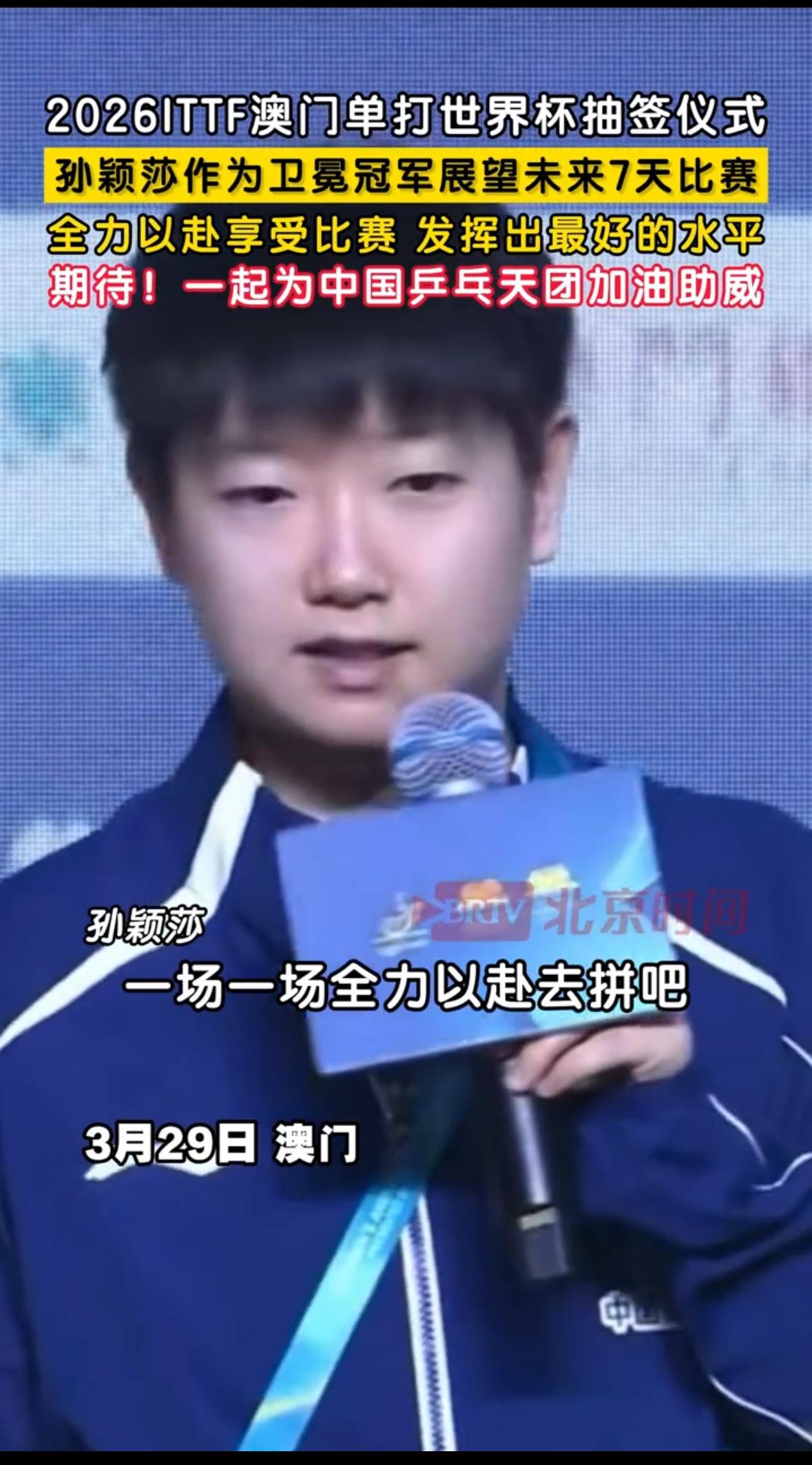 孙颖莎在澳门的发言,莎姐不是一次强调集体了,每次发言就是团结感! 无论是代表乒乓球队还是女性,孙颖莎的知识涵养都远超自己年龄阶段,这就是小人精! 想不到她付出了多少的努力才达到现在的成就,她有天赋,还暗自努力,体育生的超级学霸,父母是知识分子,莎莎更是继承了高知分子的气质,很乖巧,但是更有韧劲!
