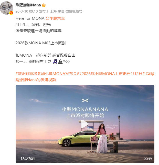 又一场时尚出行盛宴即将来袭!欧阳娜娜确认出席新品发布会,以车主视角分享真实用车体验,将年轻人在意的实用与颜值都融入其中。从日常通勤到生活出行,多项贴心升级都来自真实使用反馈。4月2日,和她一起解锁更懂年轻人的出行新体验。欧阳娜娜将参加小鹏MONA发布会